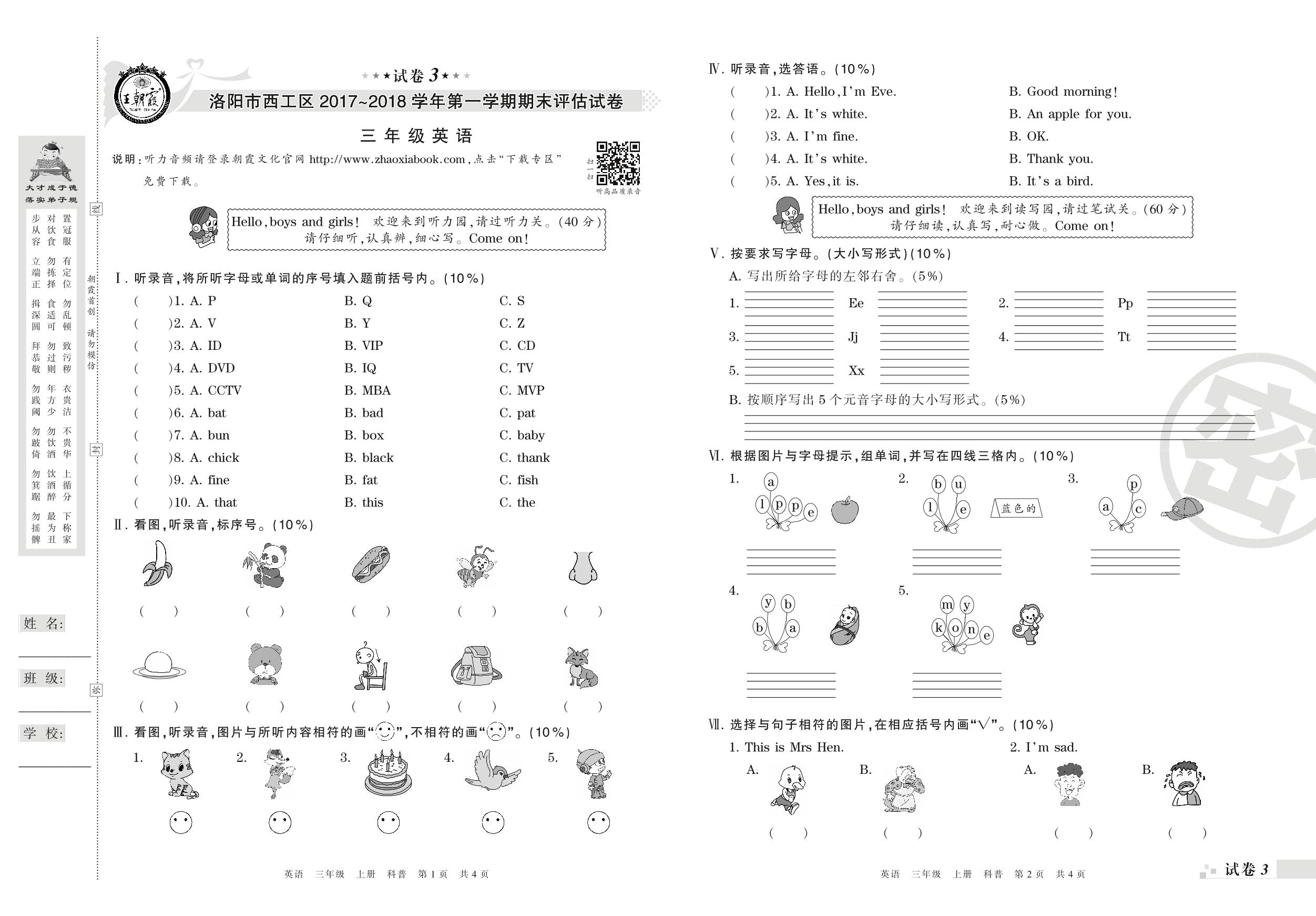 2017-2018学年第一学期洛阳市西工区三年级英语试卷(科普版)【3】