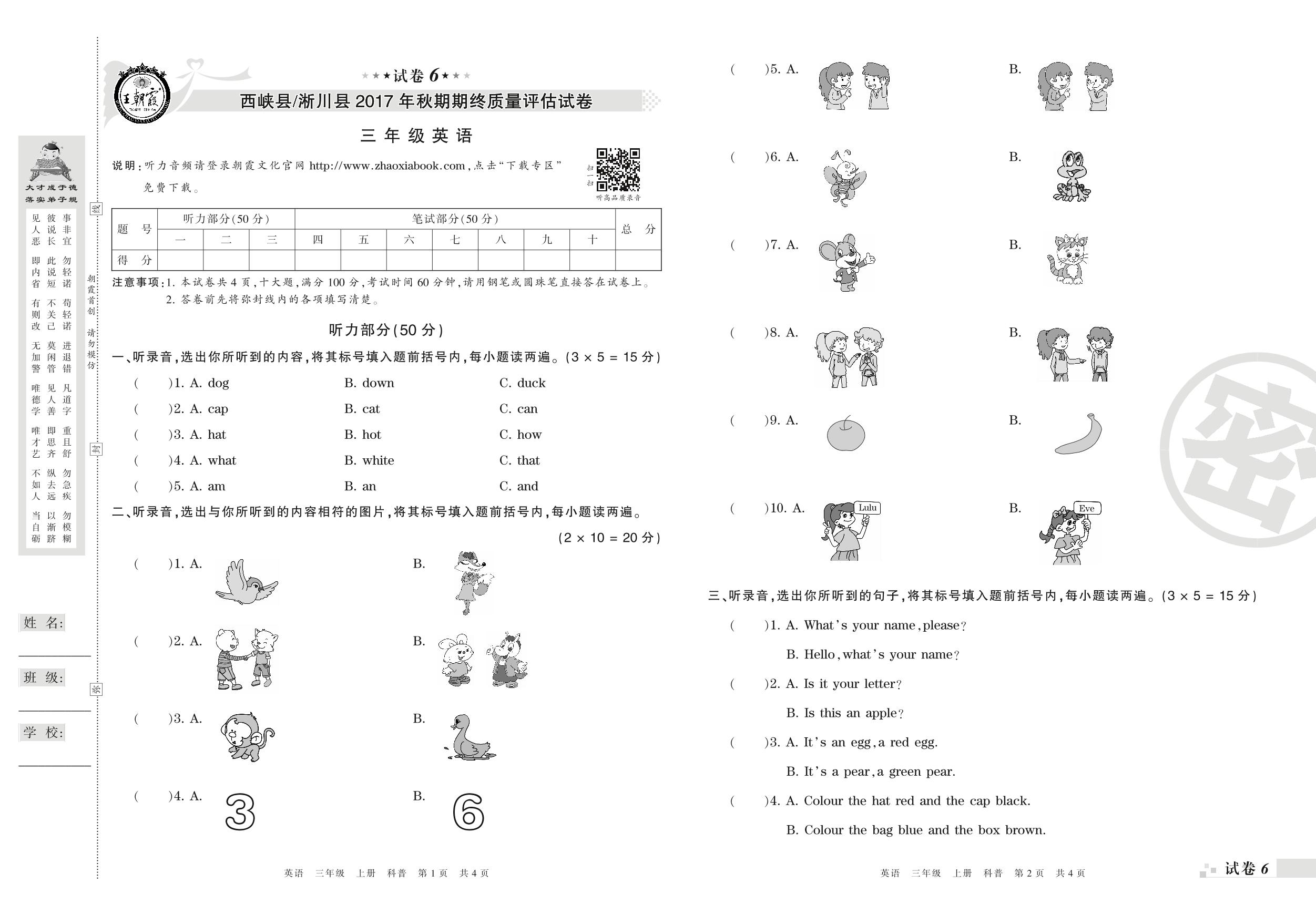 2017-2018学年第一学期南阳市西峡县 淅川县三年级英语试卷(科普版)【6】