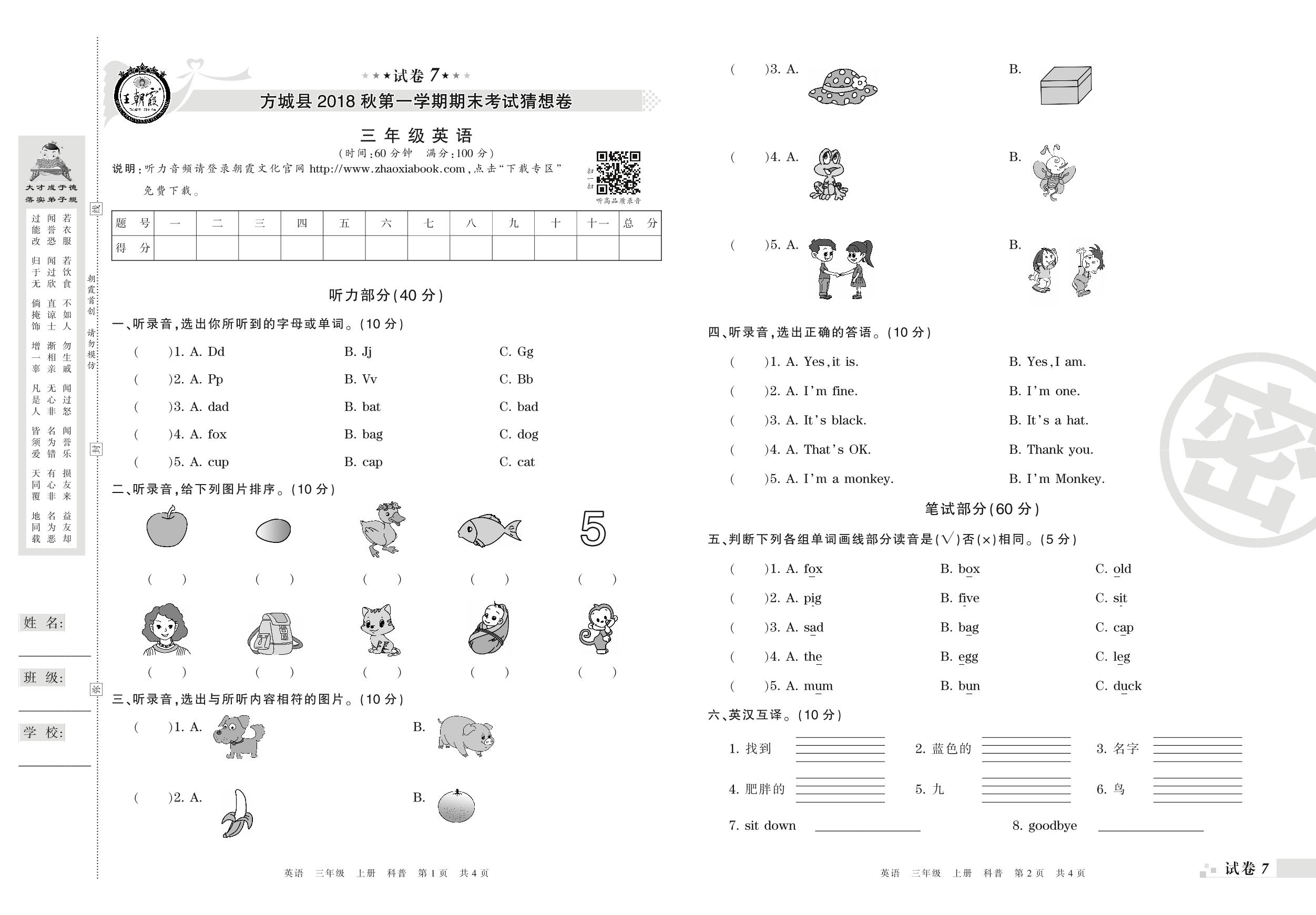 2017-2018学年第一学期南阳市方城县三年级英语试卷(科普版)【7】