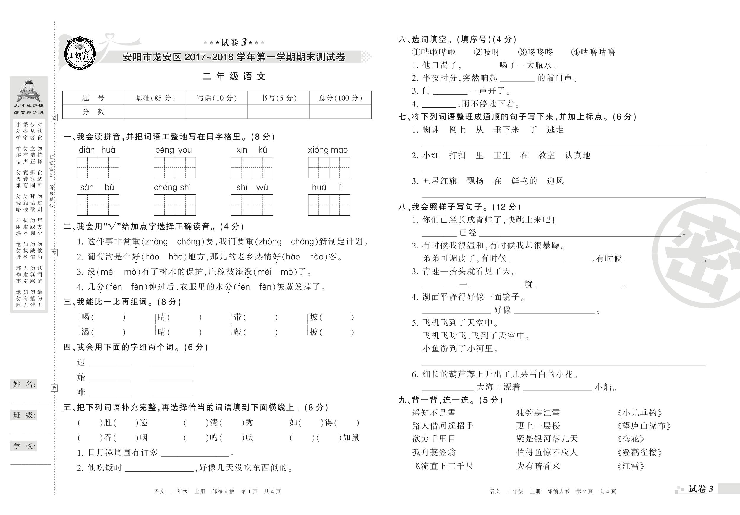 2017-2018学年第一学期安阳市龙安区二年级语文试卷(人教版)【3】