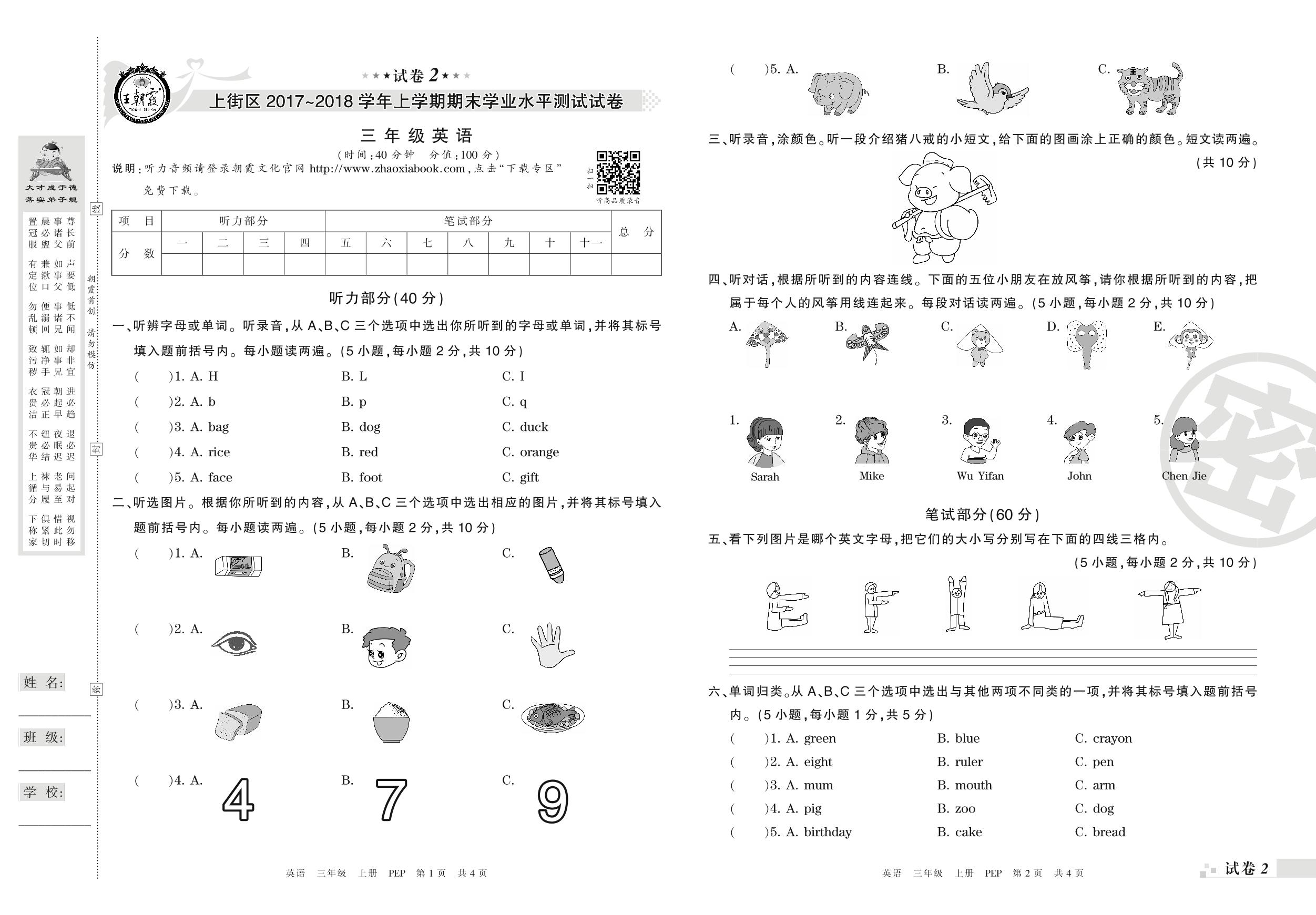 2017-2018学年第一学期郑州市上街区三年级英语试卷(PEP版)【2】