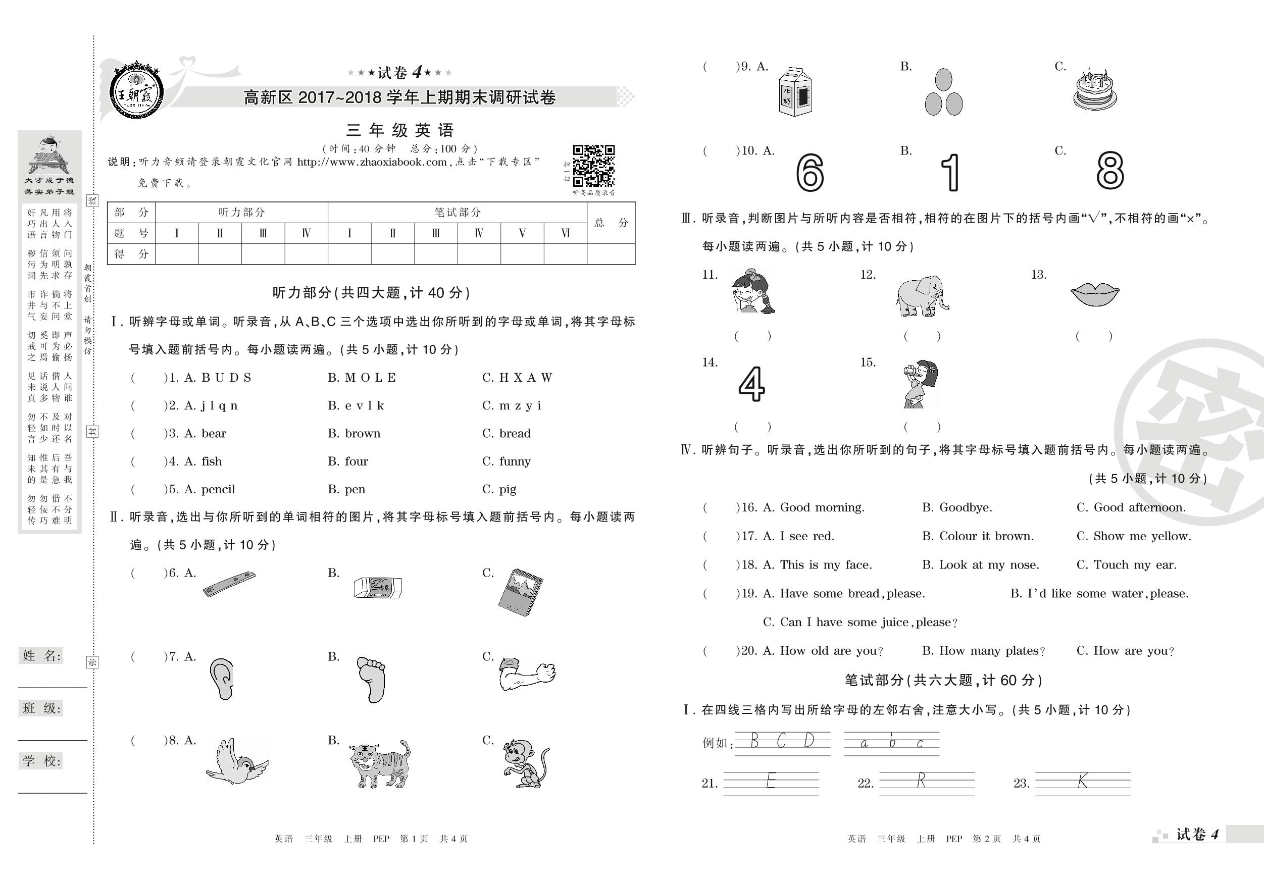 2017-2018学年第一学期郑州市高新区三年级英语试卷(PEP版)【4】