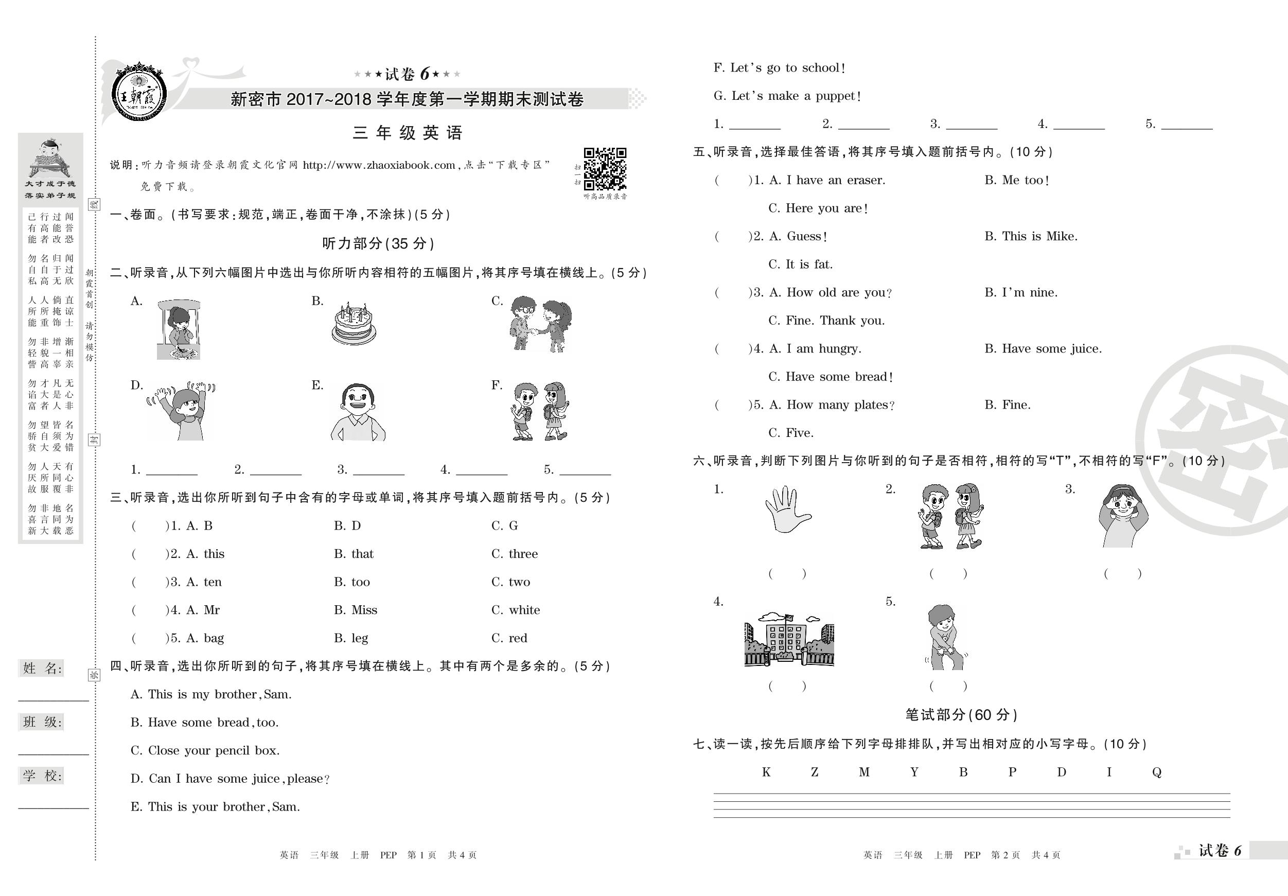 2017-2018学年第一学期新密市三年级英语试卷(PEP版)【6】
