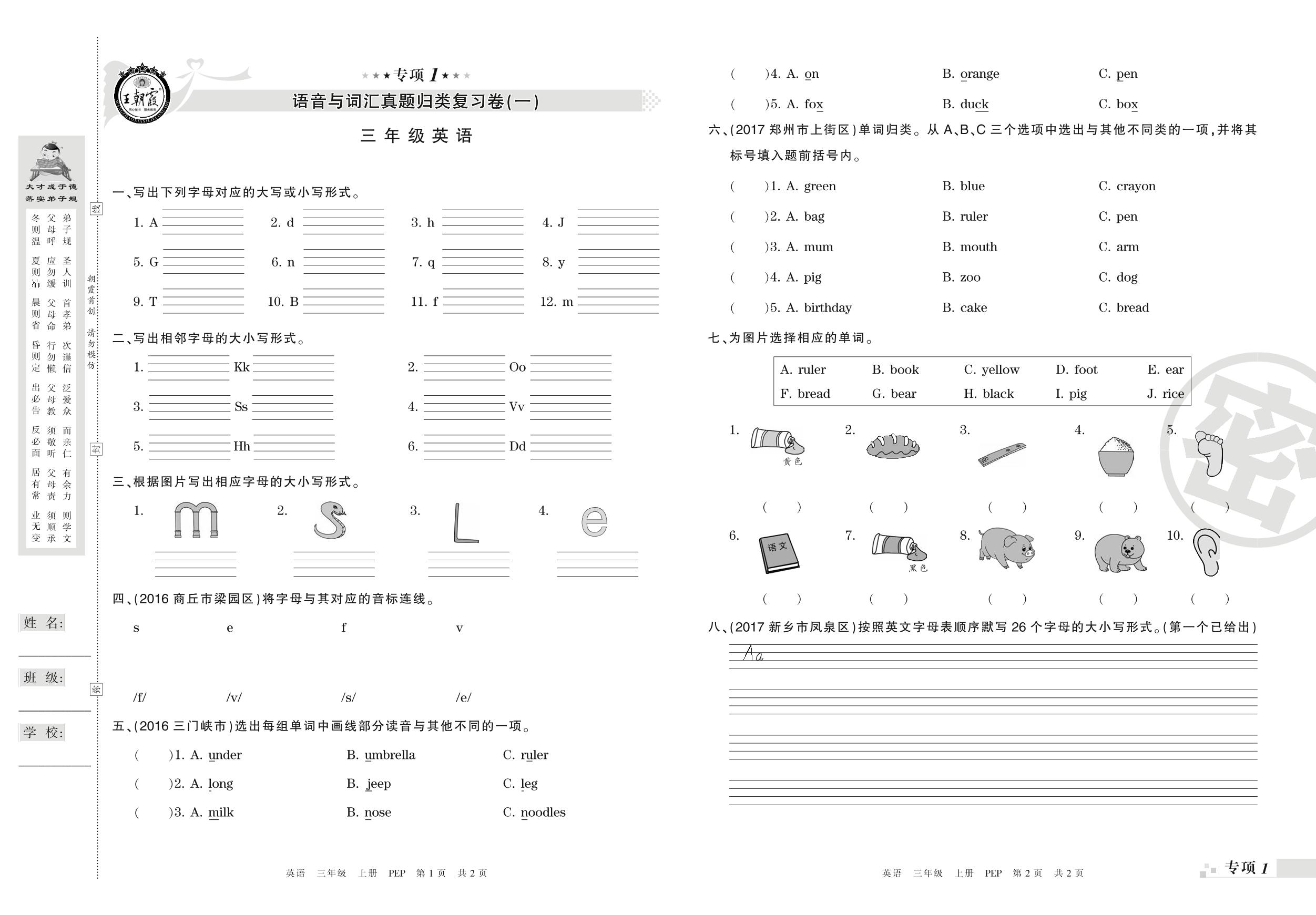 王朝霞期末专项卷——语音与词汇真题归类复习三年级上册英语(PEP版)【0】