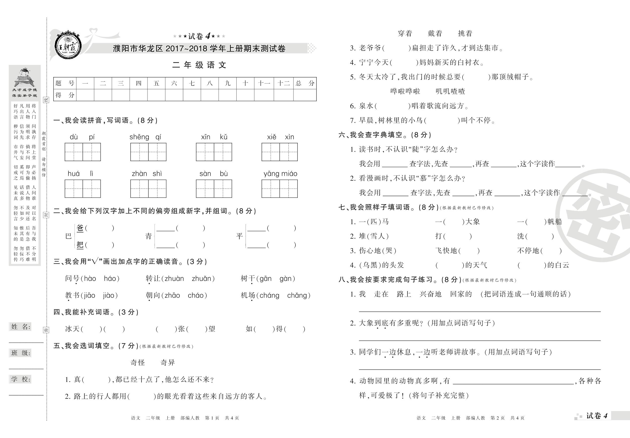 2017-2018学年第一学期濮阳市华龙区二年级语文试卷(人教版)【4】