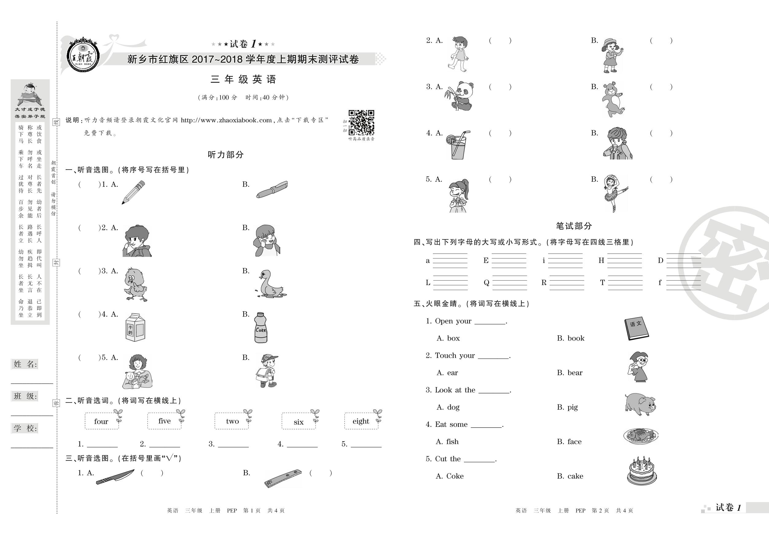 2017-2018学年第一学期新乡市红旗区三年级英语试卷(PEP版)【1】