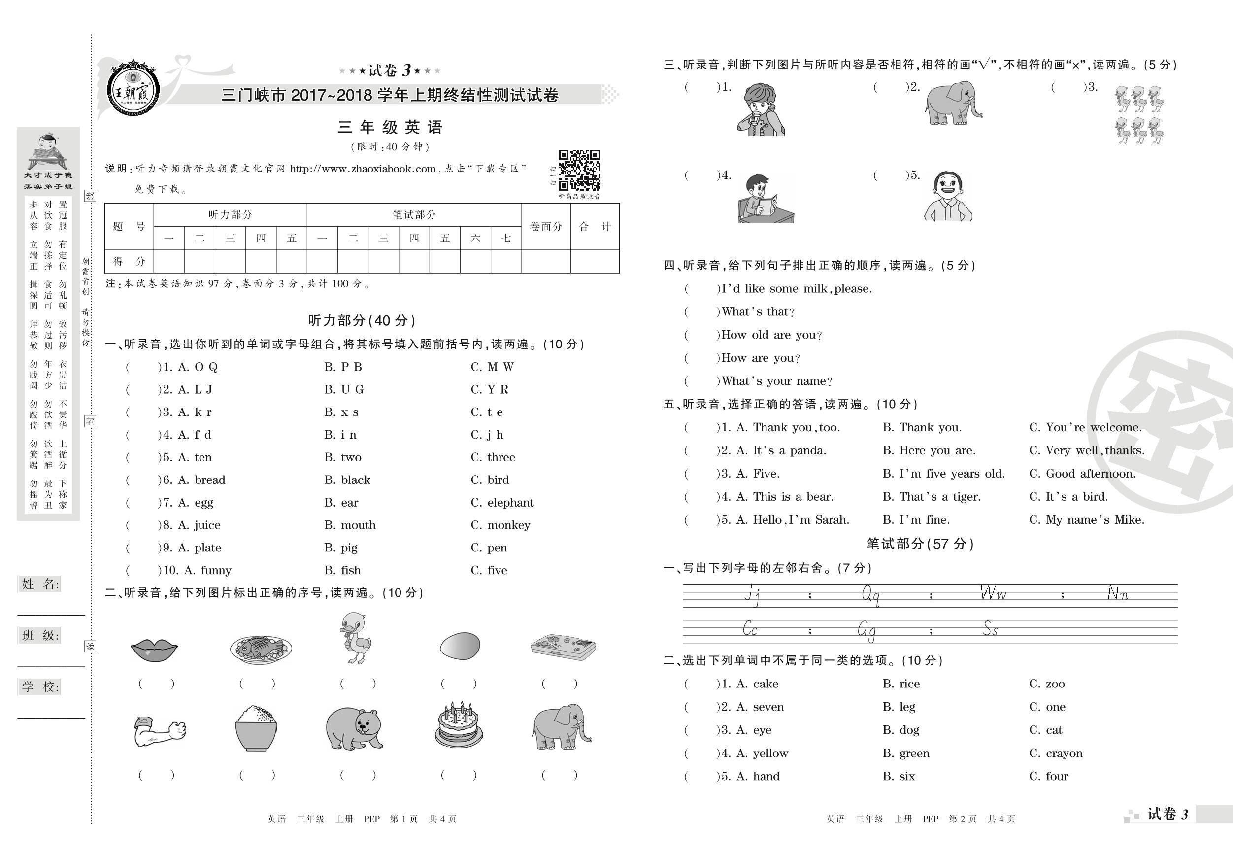 2017-2018学年第一学期三门峡市三年级英语试卷(PEP版)【3】