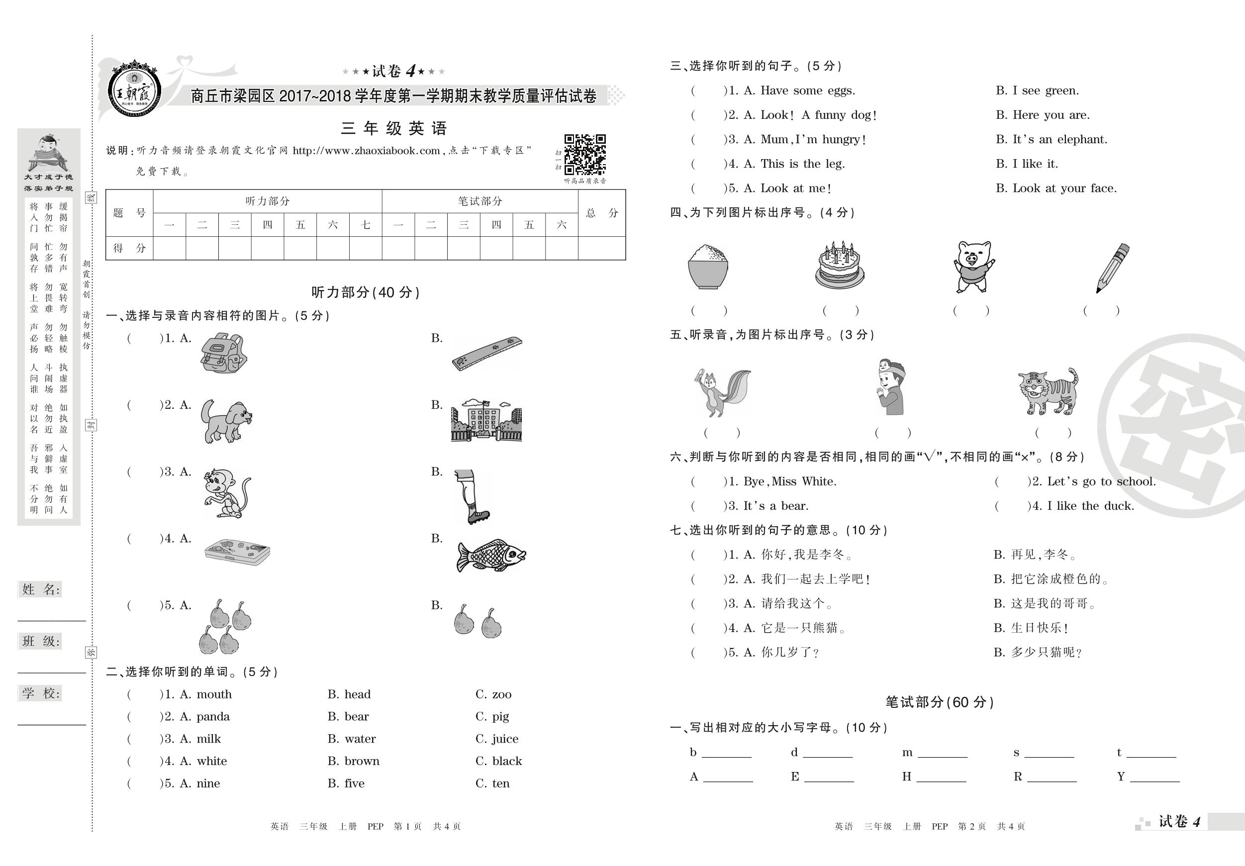 2017-2018学年第一学期商丘市梁园区三年级英语试卷(PEP版)【4】