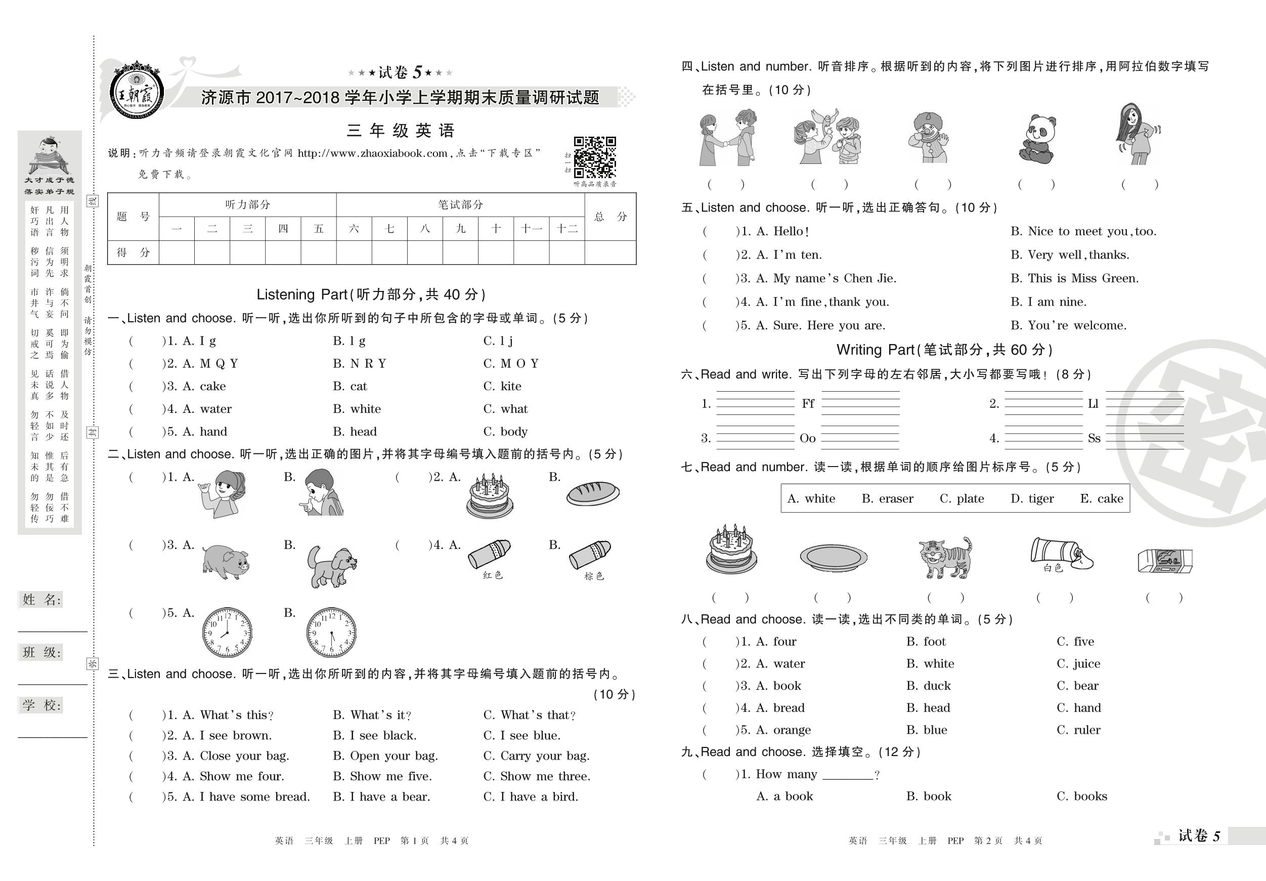 2017-2018学年第一学期济源市三年级英语试卷(PEP版)【5】