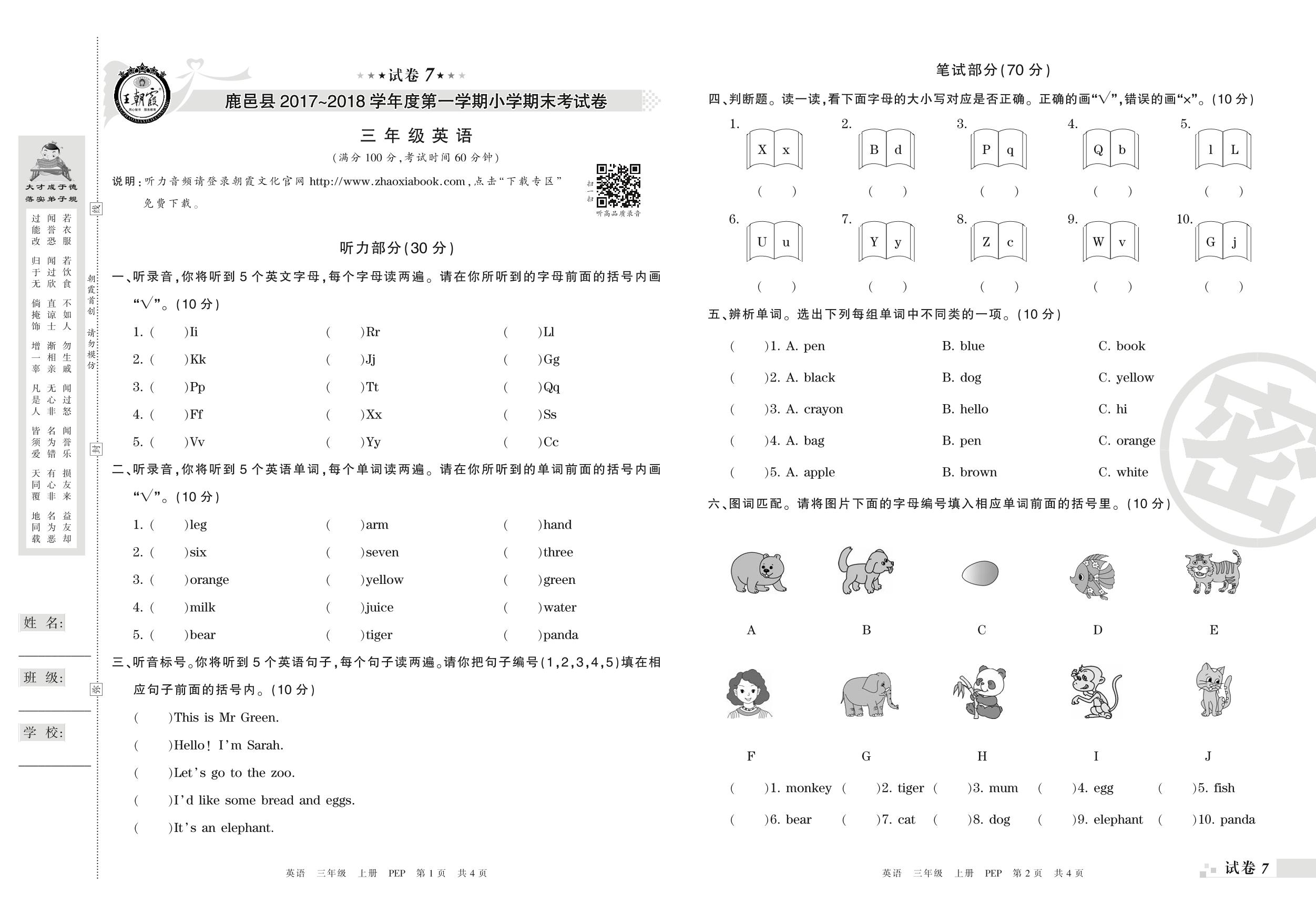 2017-2018学年第一学期周口市鹿邑县三年级英语试卷(PEP版)【7】