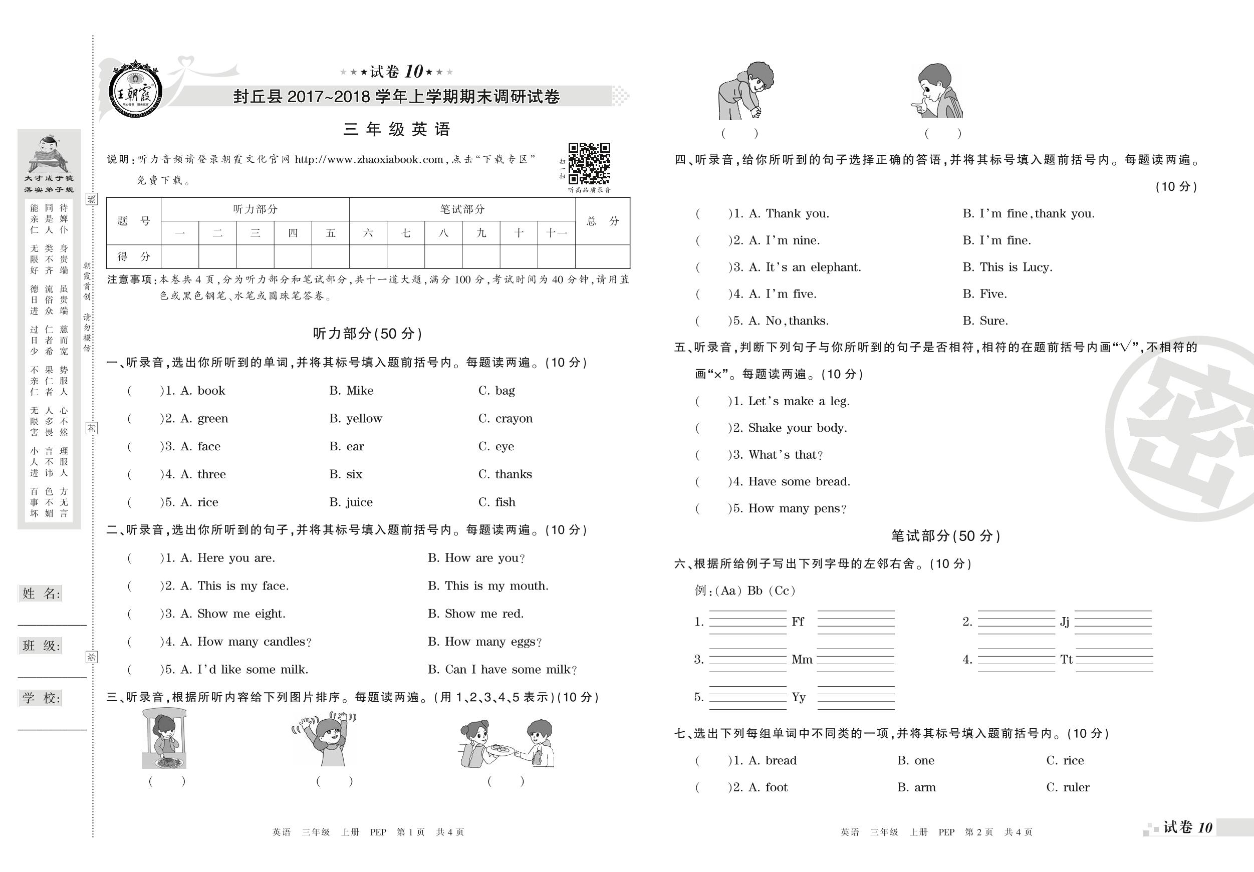 2017-2018学年第一学期新乡市封丘县三年级英语试卷(PEP版)【10】