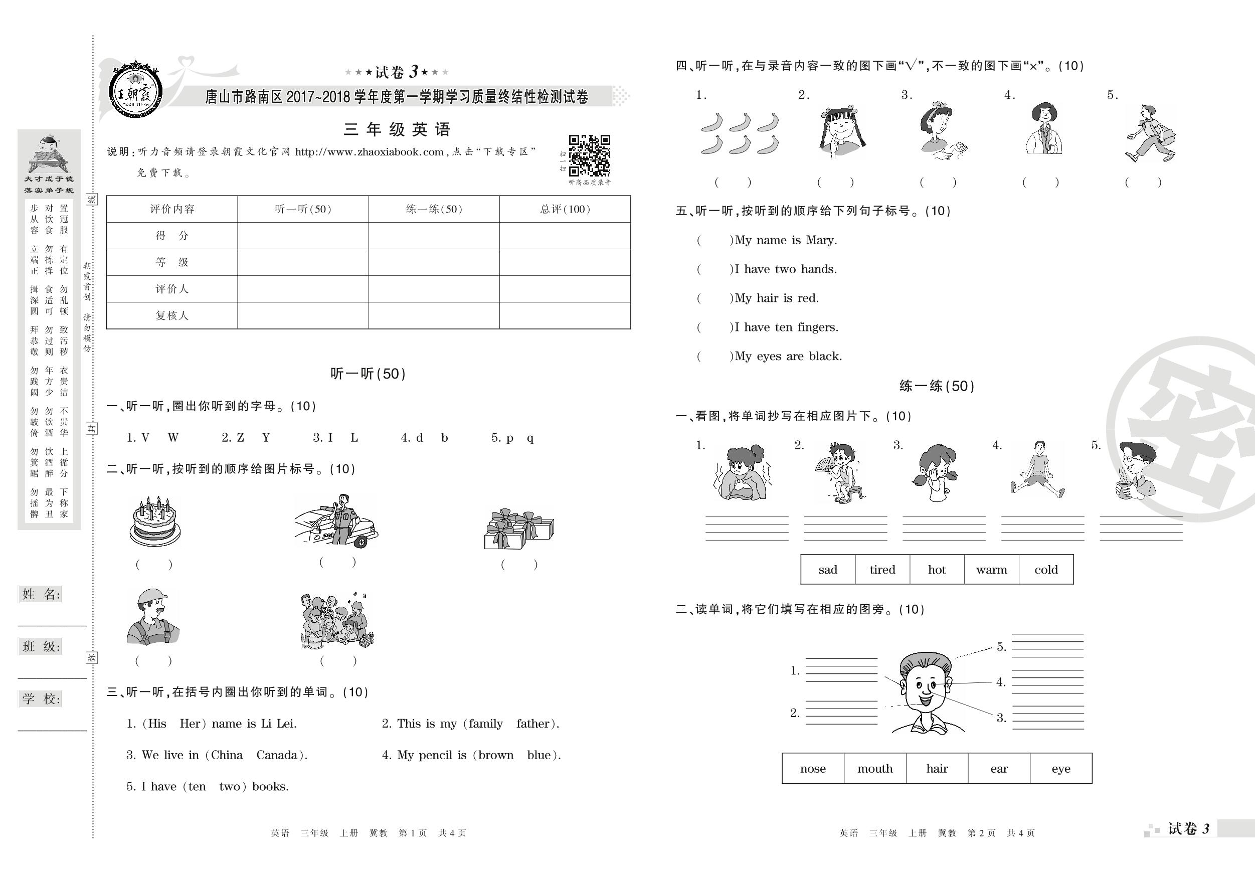 2017-2018学年第一学期唐山市路南区三年级英语试卷(冀教版)【3】