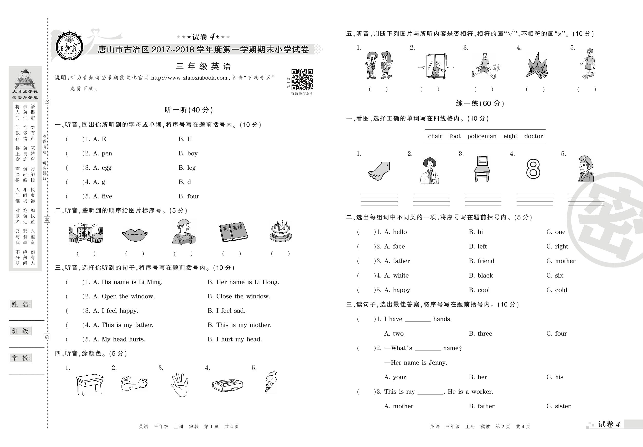 2017-2018学年第一学期唐山市古冶区三年级英语试卷(冀教版)【4】