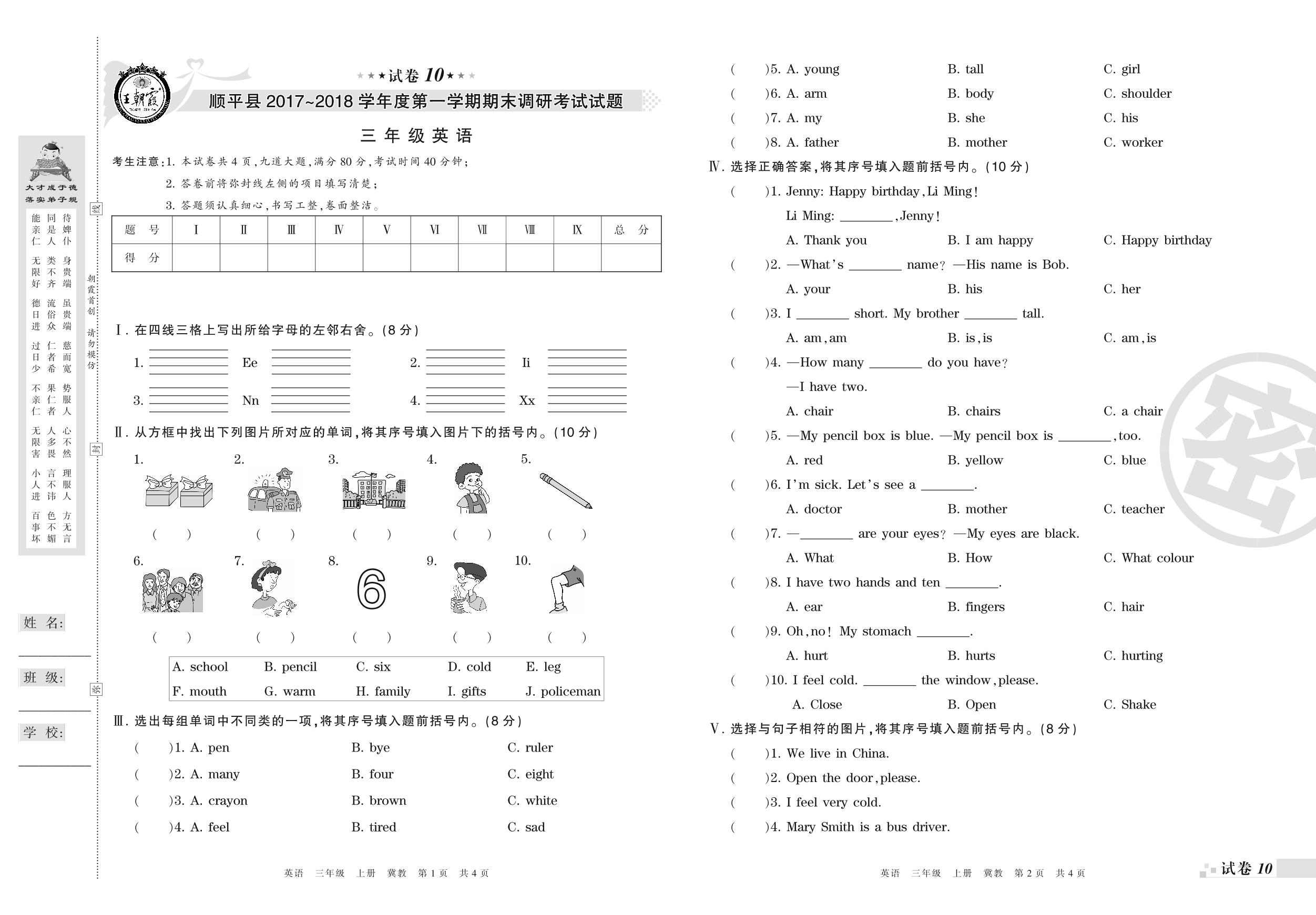 2017-2018学年第一学期保定市顺平县三年级英语试卷(冀教版)【10】