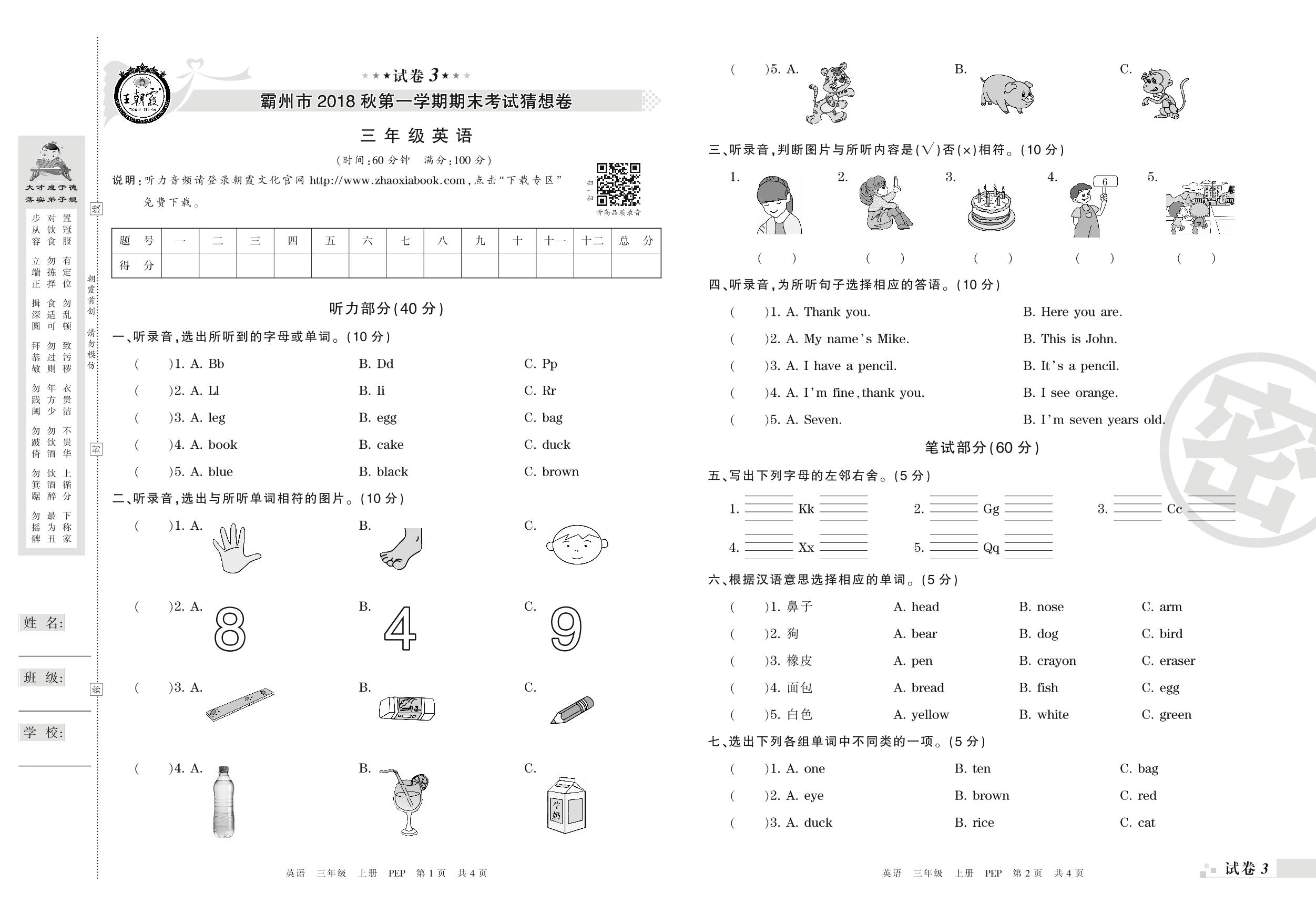 2017-2018学年第一学期霸州市三年级英语试卷(PEP版)【3】