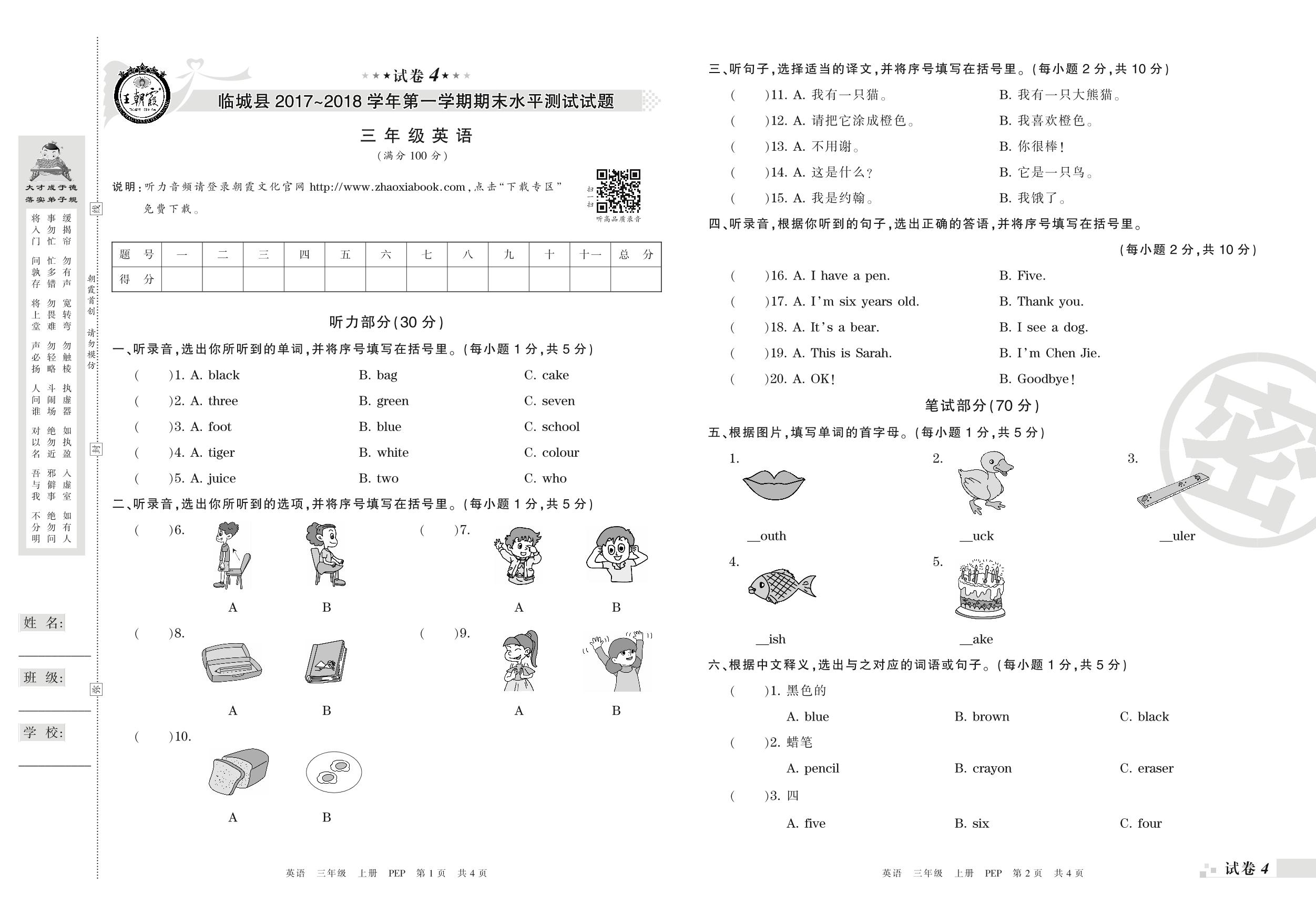 2017-2018学年第一学期邢台市临城县三年级英语试卷(PEP版)【4】