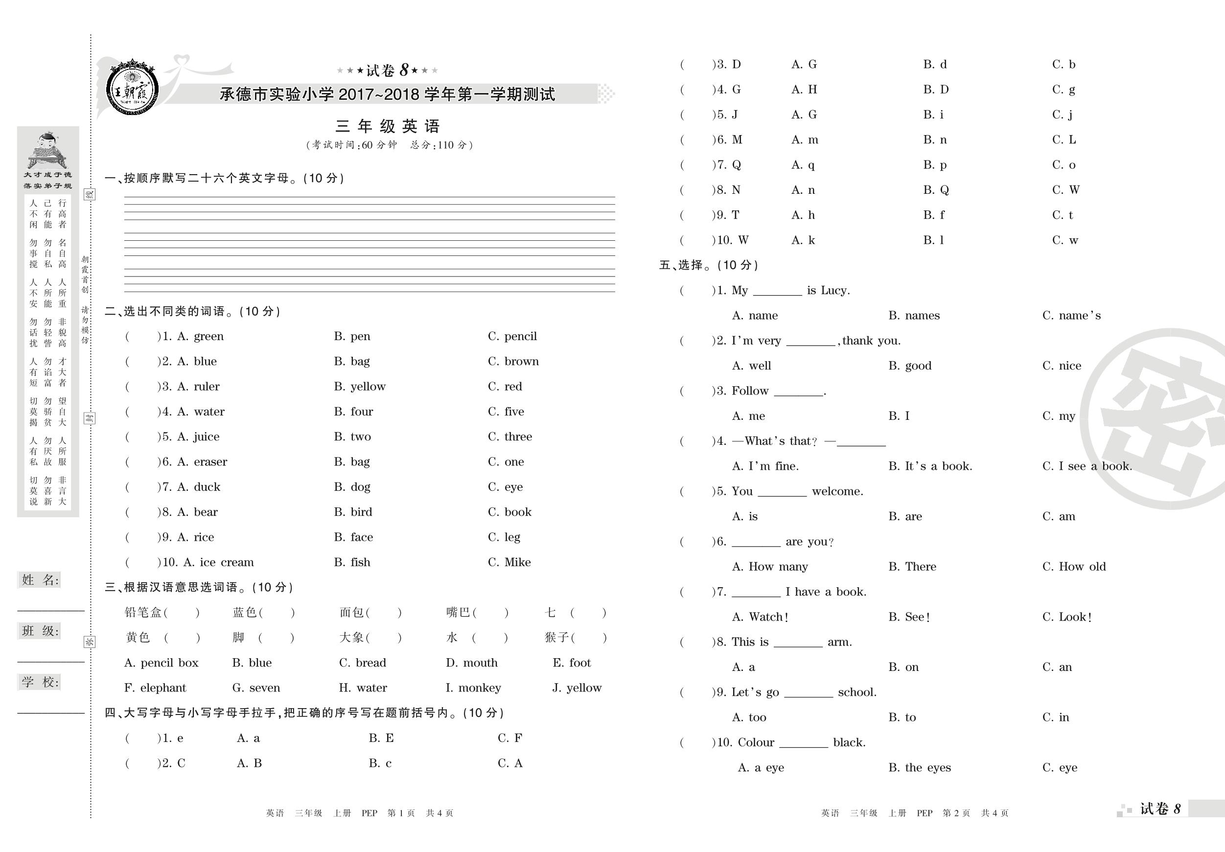 2017-2018学年第一学期承德市实验小学三年级英语试卷(PEP版)【8】