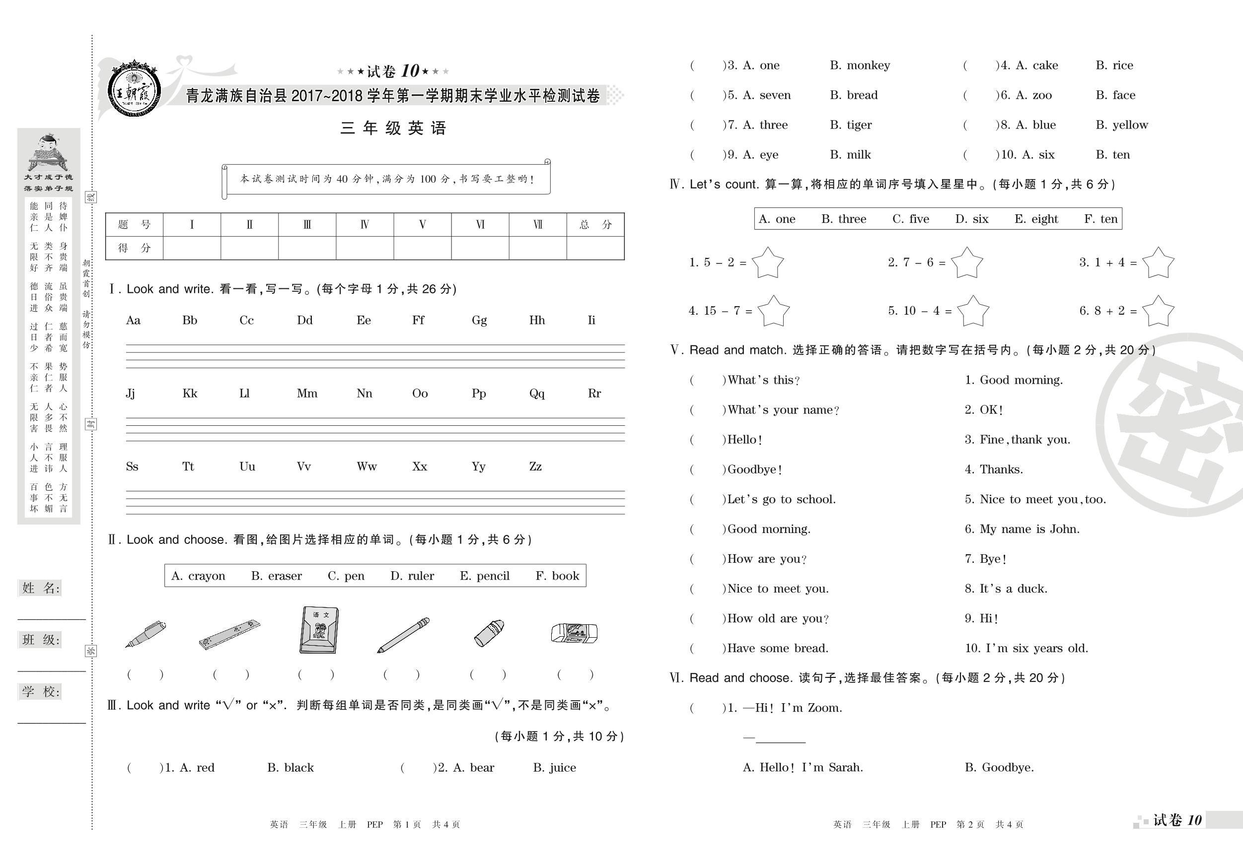 2017-2018学年第一学期秦皇岛市青龙满族自治县三年级英语试卷(PEP版)【10】