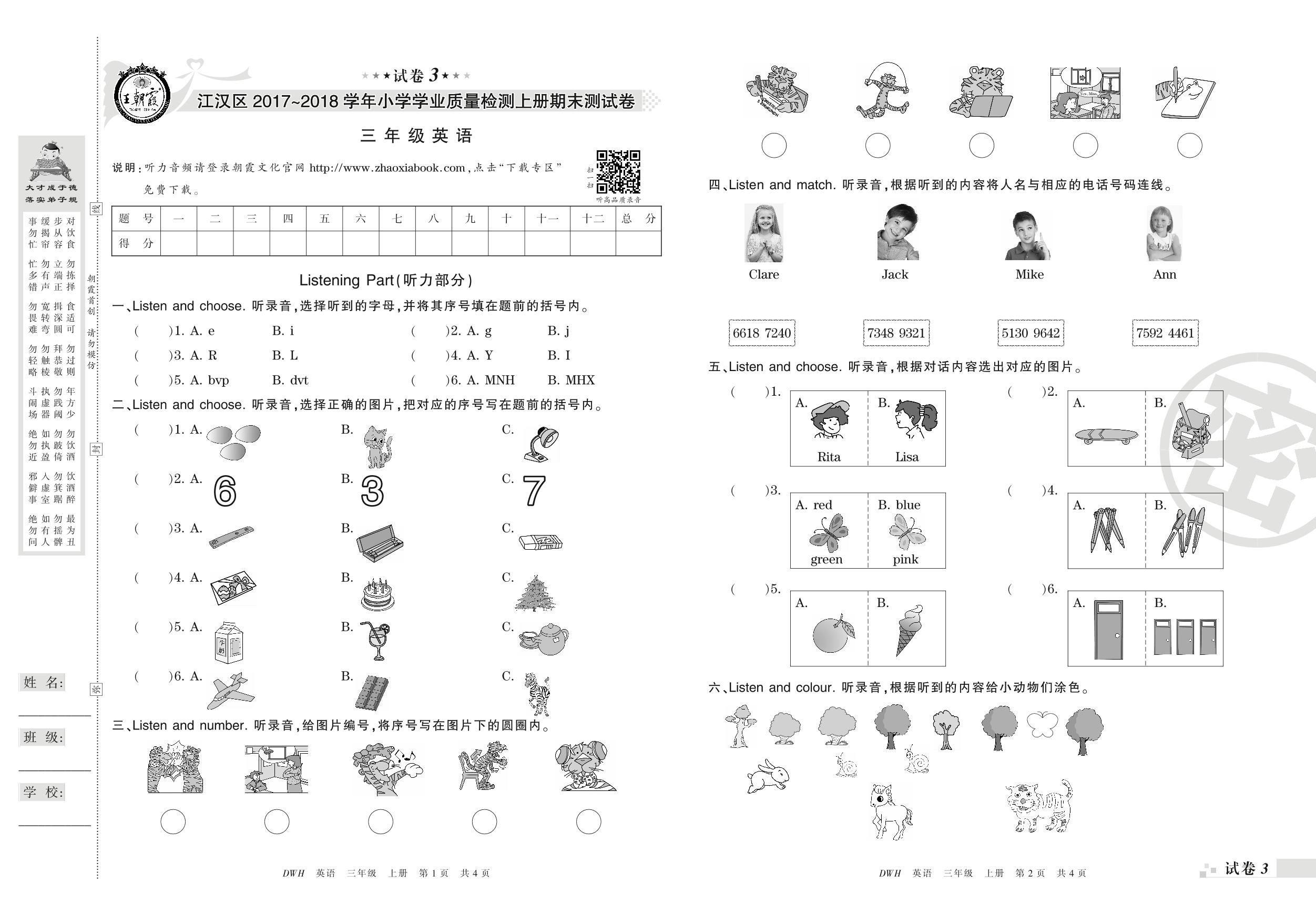 2017-2018学年第一学期武汉市江汉区三年级英语试卷(剑桥版)【3】