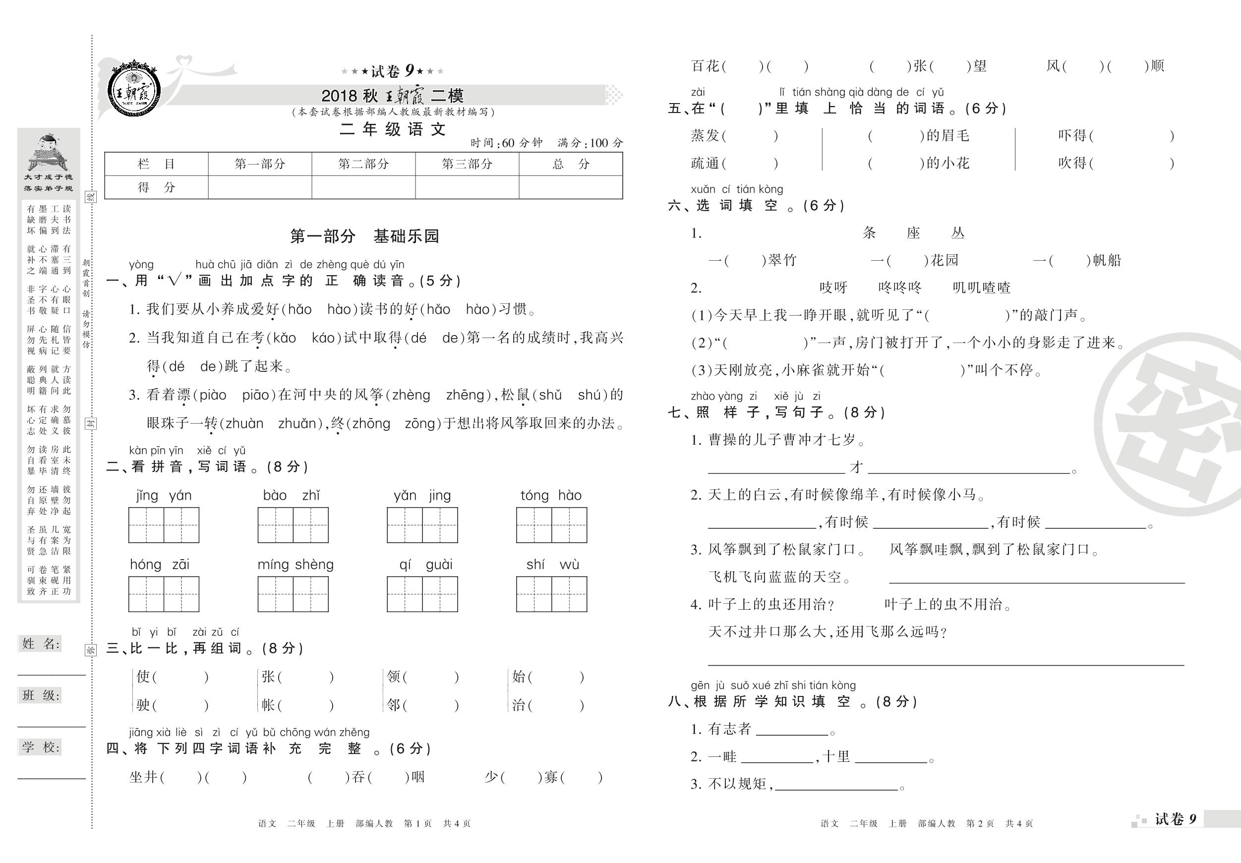 王朝霞期末模拟卷二年级上册语文(人教版)_R21080180850【9】