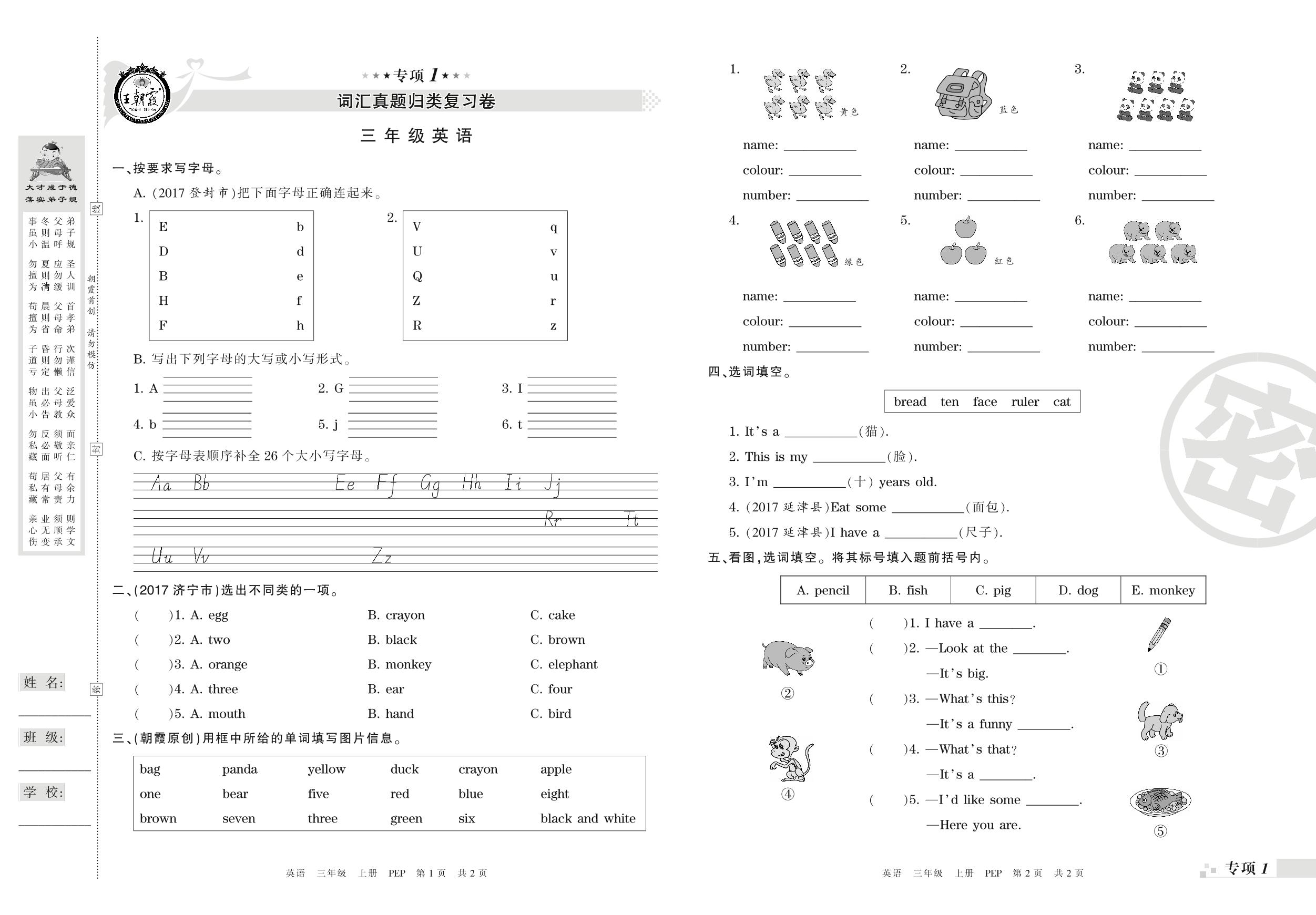 王朝霞期末专项卷——词汇、句子真题归类复习三年级上册英语(PEP版)_R210806194958【0】