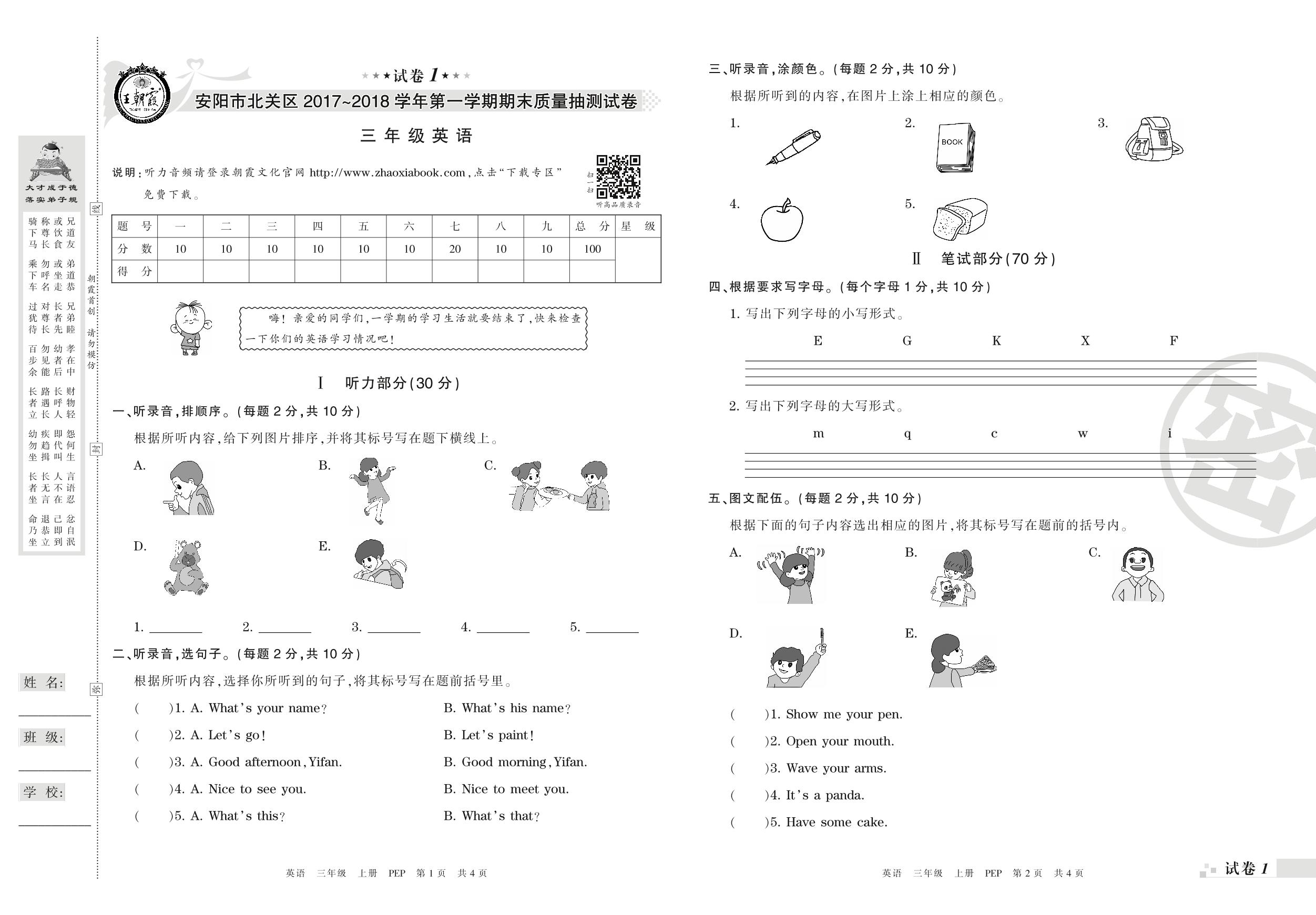 2017-2018学年第一学期安阳市北关区三年级英语试卷(PEP版)【1】