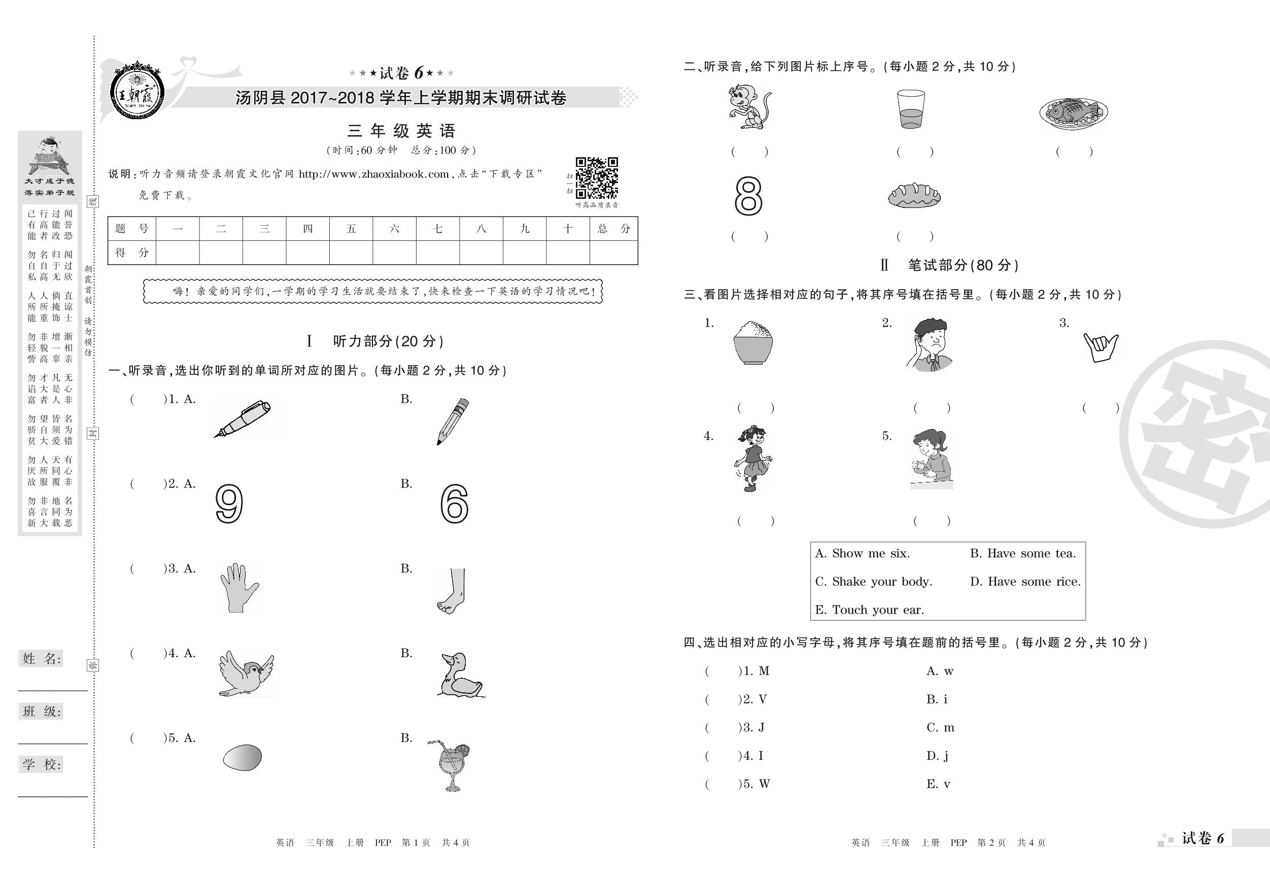 2017-2018学年第一学期安阳市汤阴县三年级英语试卷(PEP版)【6】