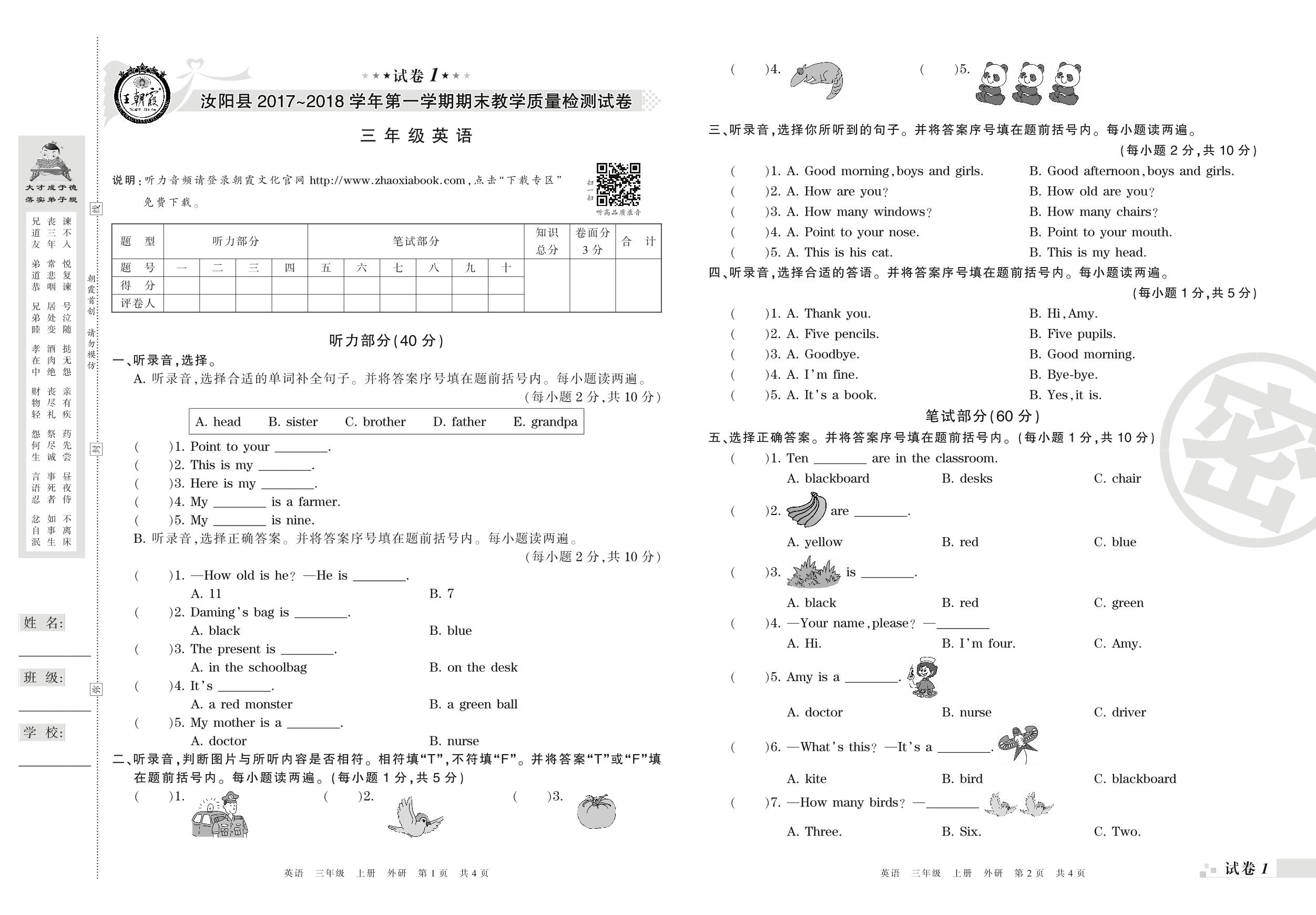 2017-2018学年第一学期洛阳市汝阳县三年级英语试卷(外研版)【1】