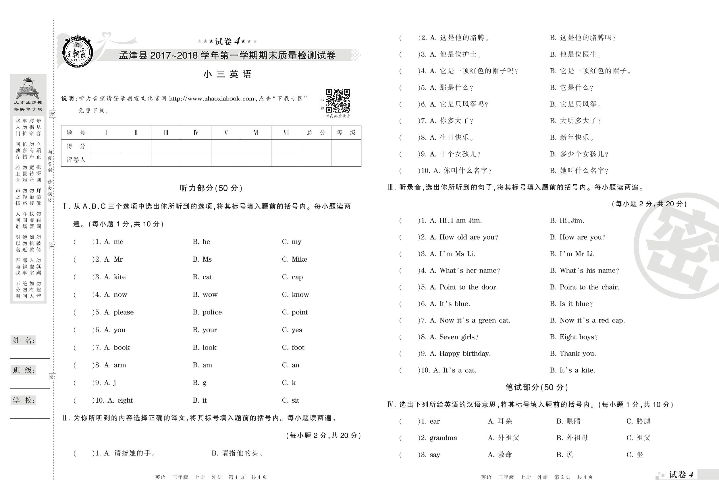 2017-2018学年第一学期洛阳市孟津县三年级英语试卷(外研版)【4】