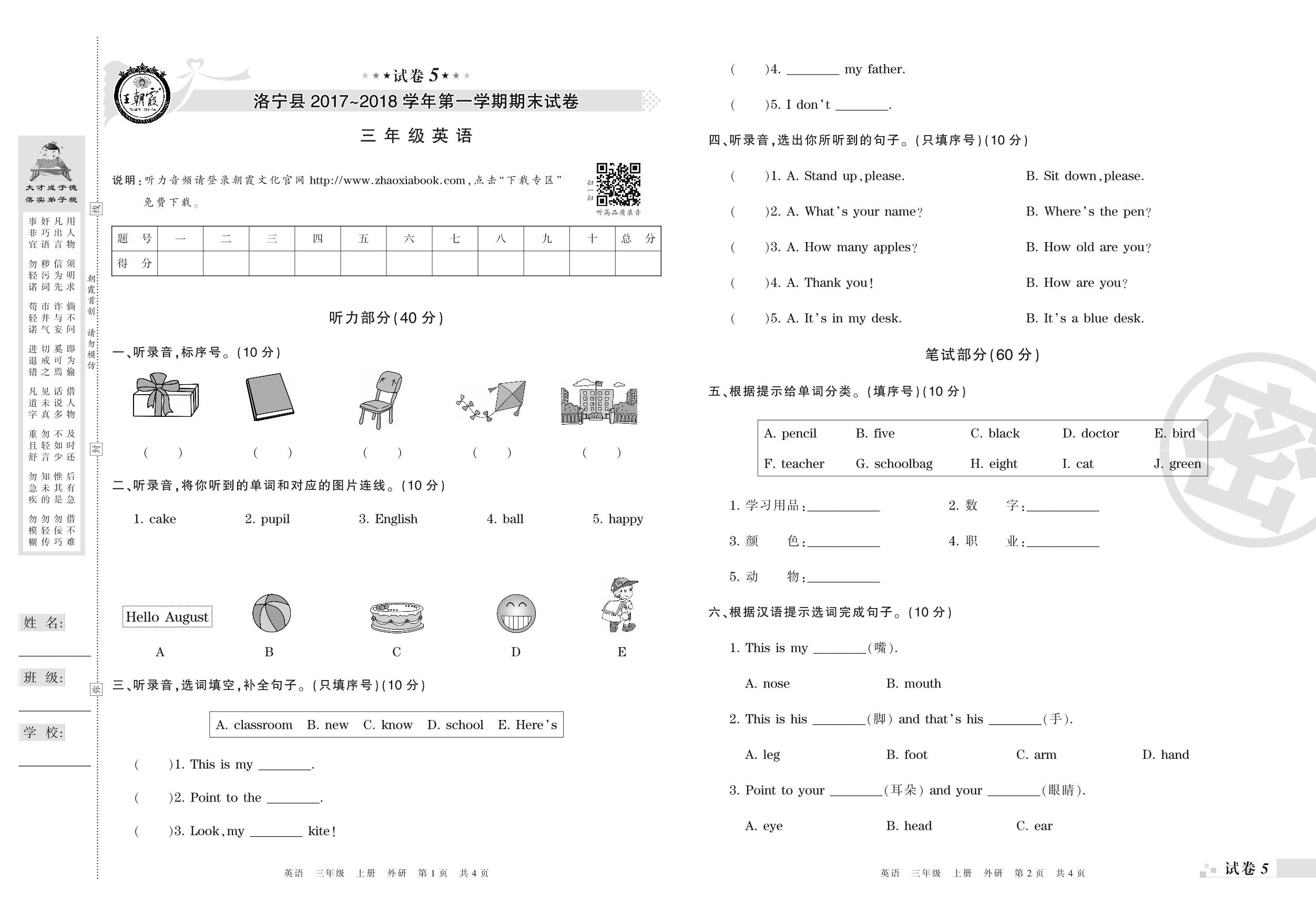 2017-2018学年第一学期洛阳市洛宁县三年级英语试卷(外研版)【5】