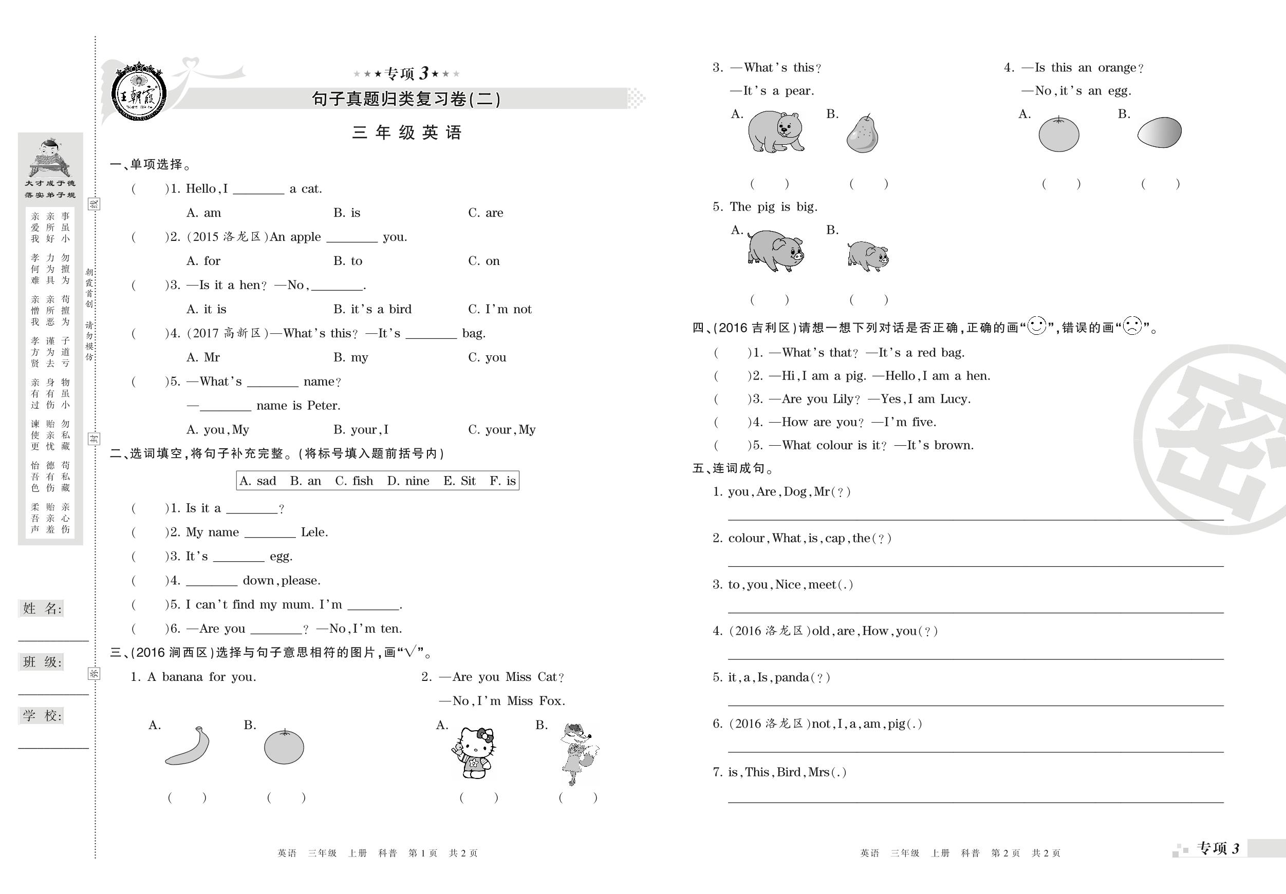 三年级英语科普版上册专项卷
