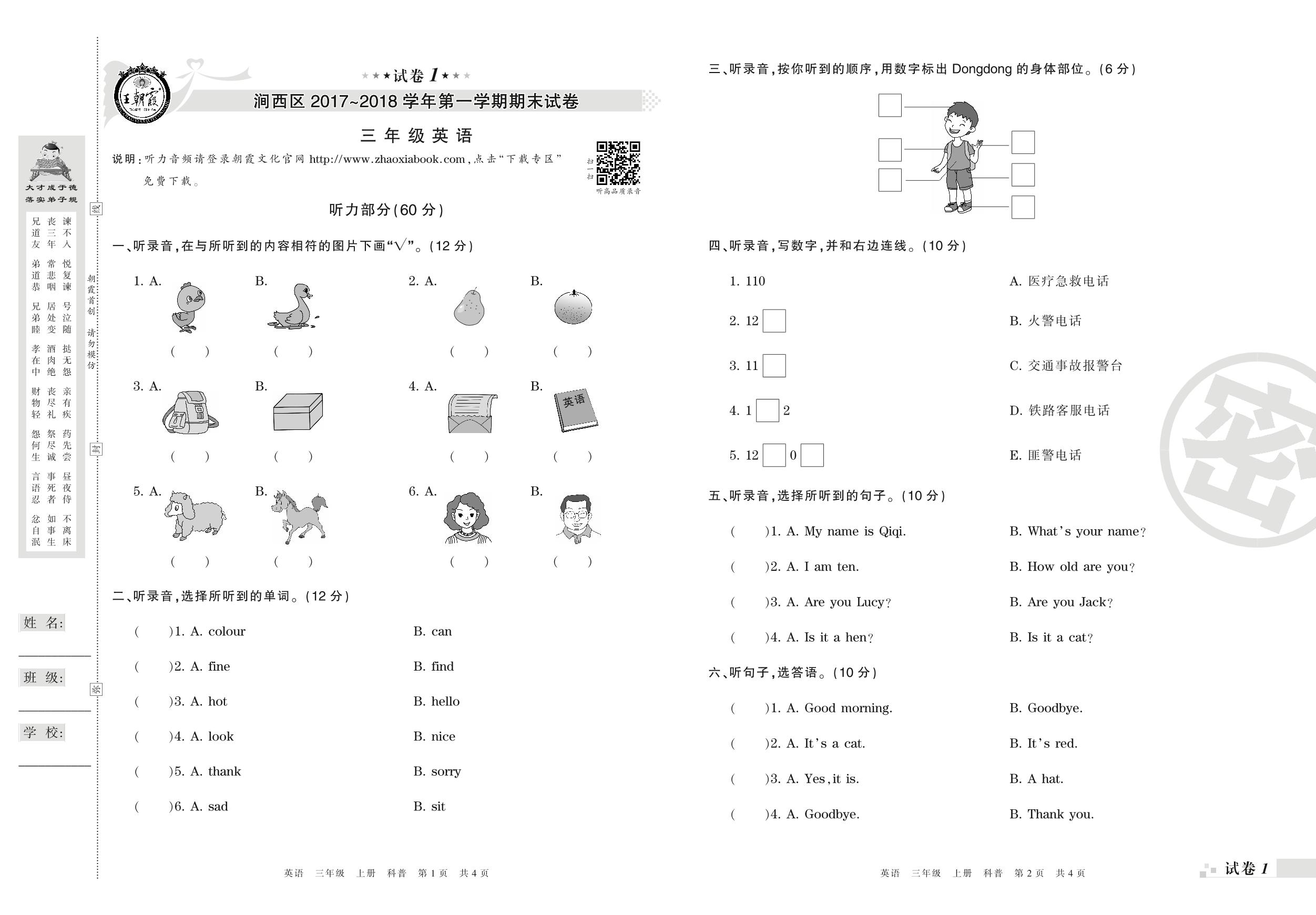 2017-2018学年第一学期洛阳市涧西区三年级英语试卷(科普版)【1】