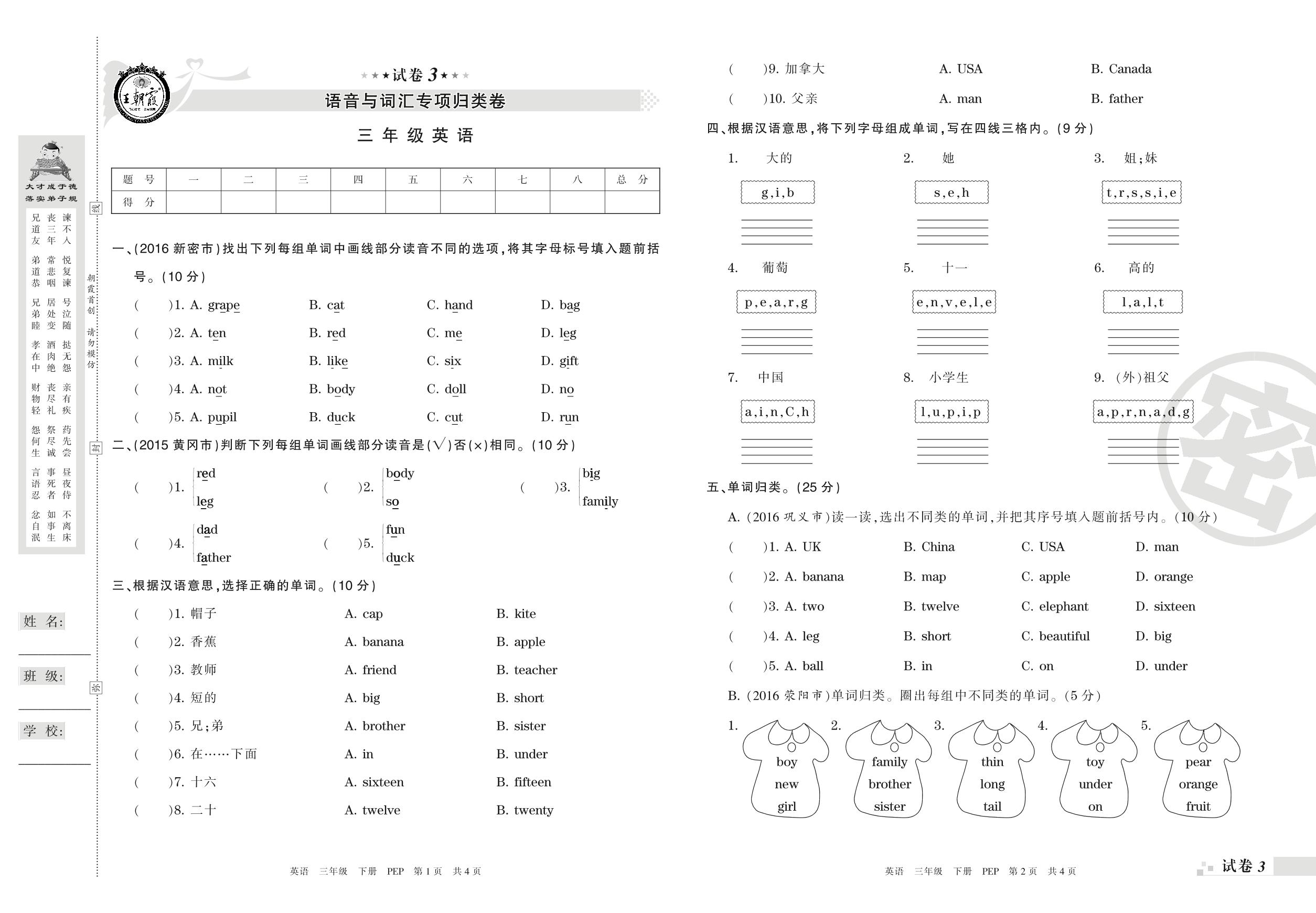 王朝霞期末专项卷——语音与词汇专项归类卷三年级下册英语(PEP版)【3】