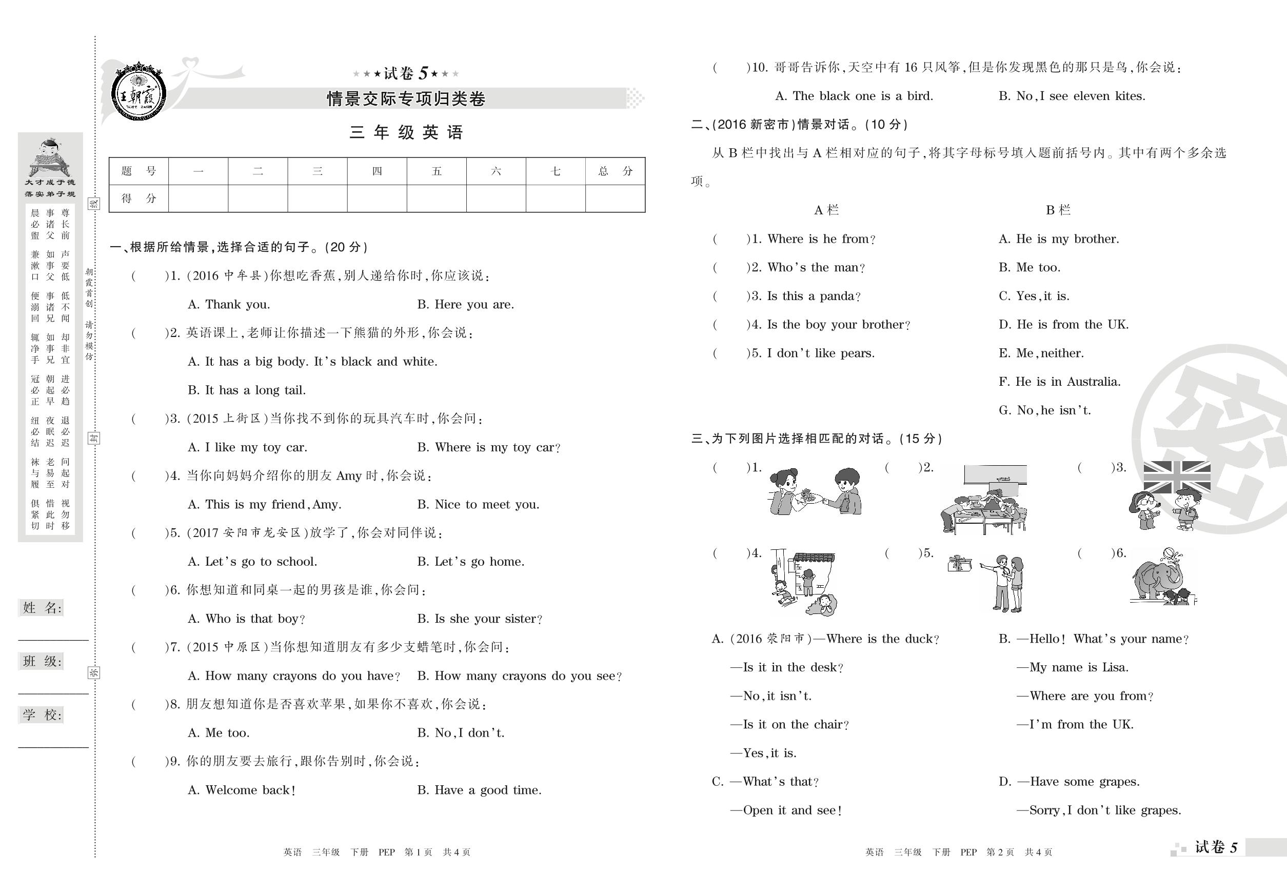 王朝霞期末专项卷——情景交际专项归类卷三年级下册英语(PEP版)【5】