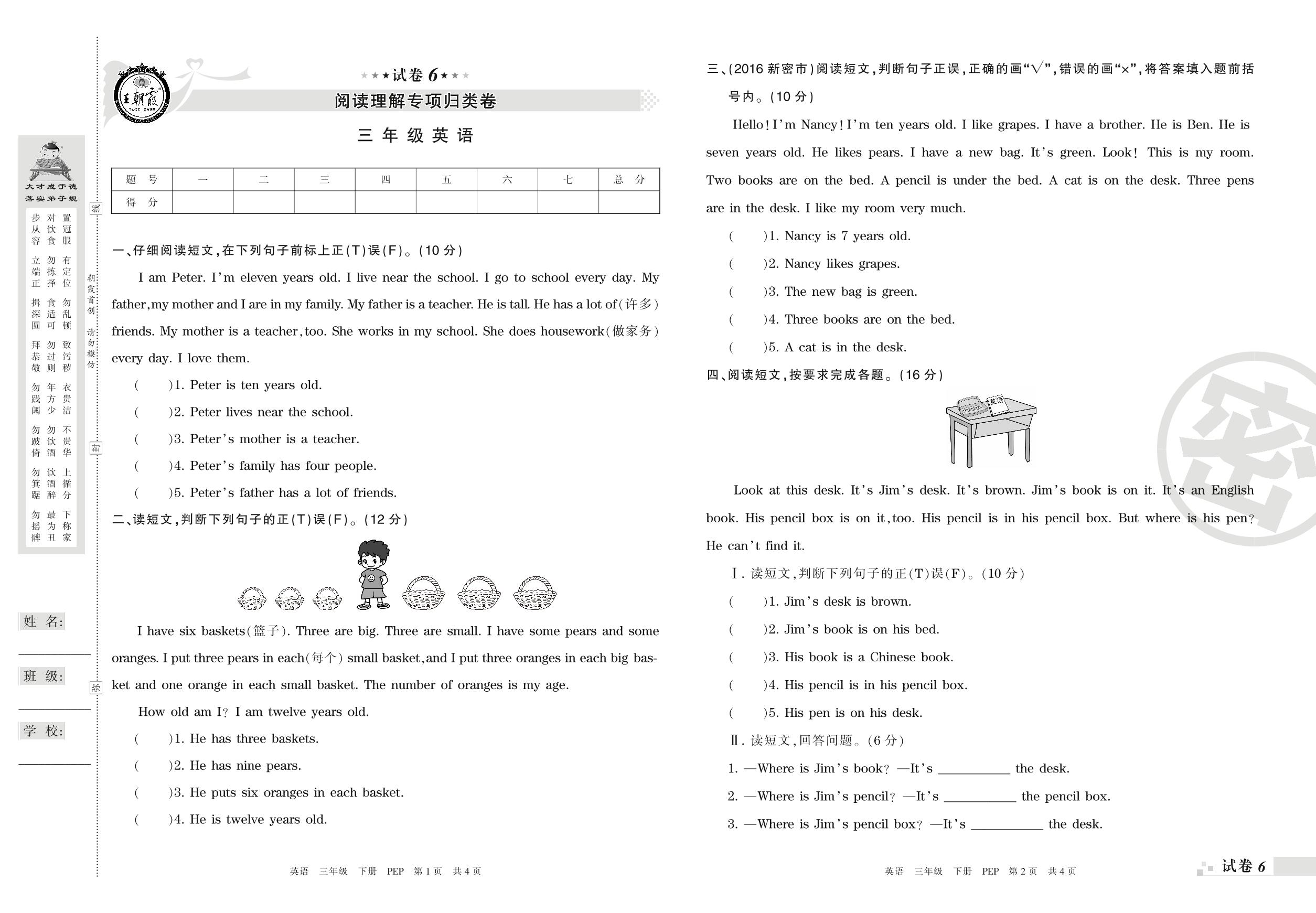 王朝霞期末专项卷——阅读理解专项归类卷三年级下册英语(PEP版)【6】