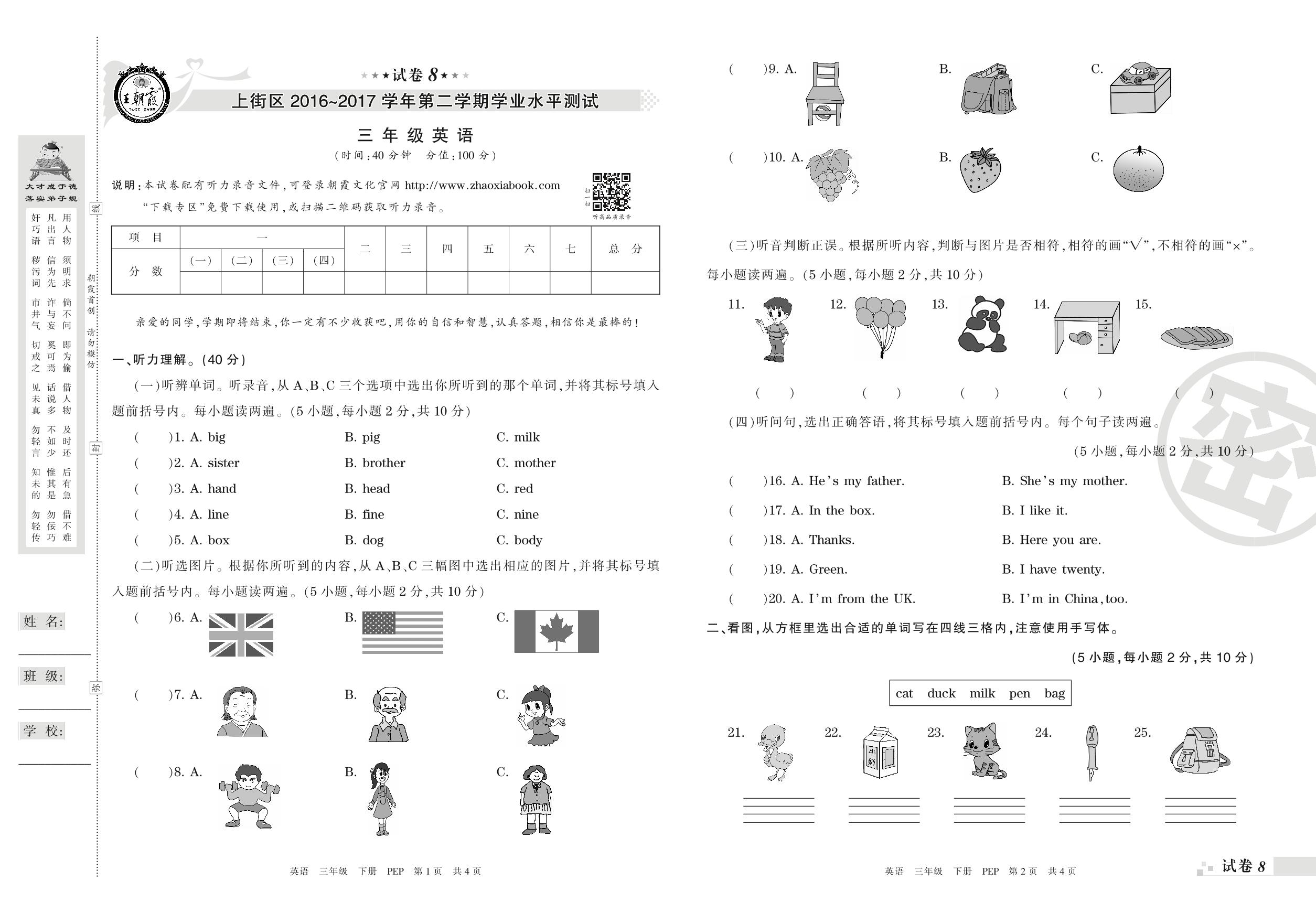 2016-2017学年第二学期郑州市上街区三年级英语试卷(PEP版)【8】
