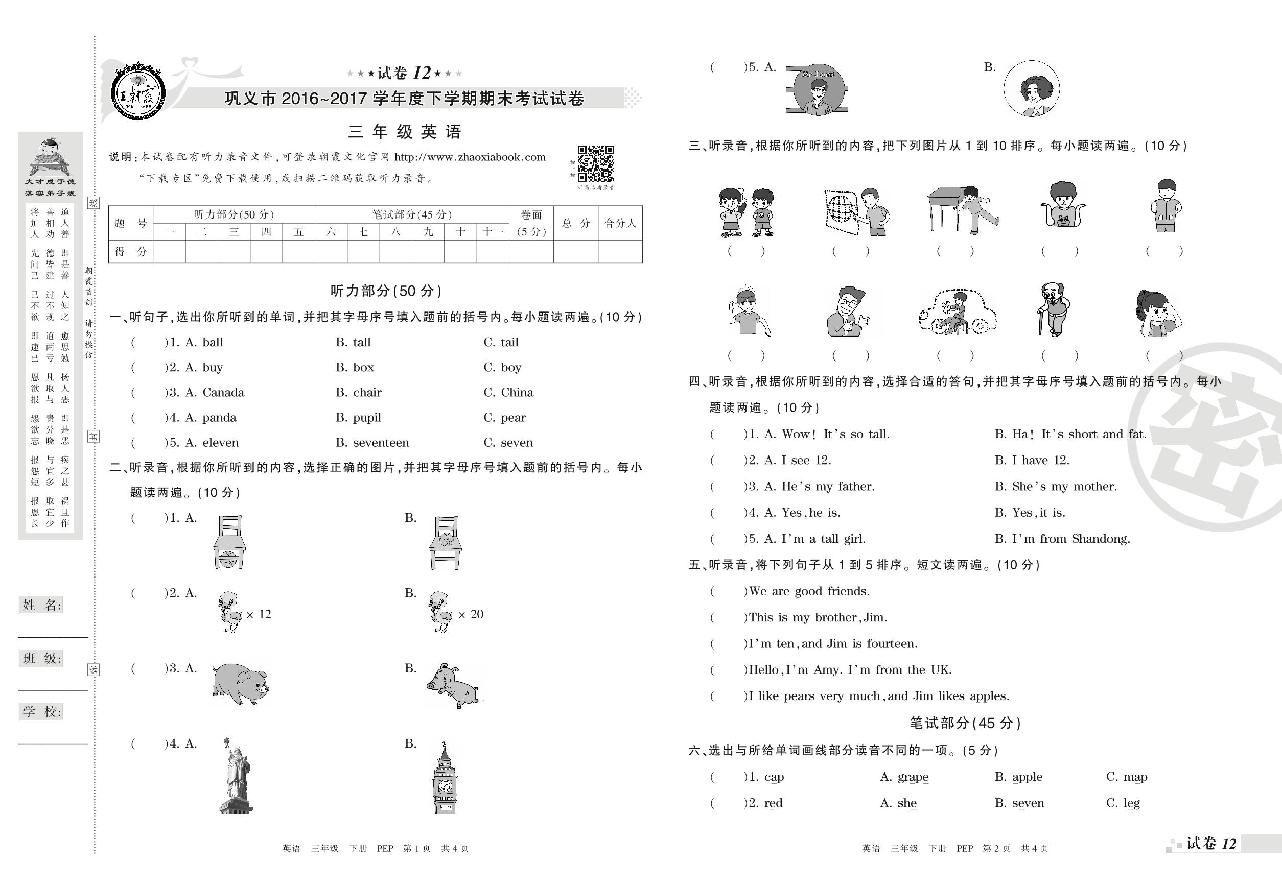 2016-2017学年第二学期巩义市三年级英语试卷(PEP版)_R210806195343【12】