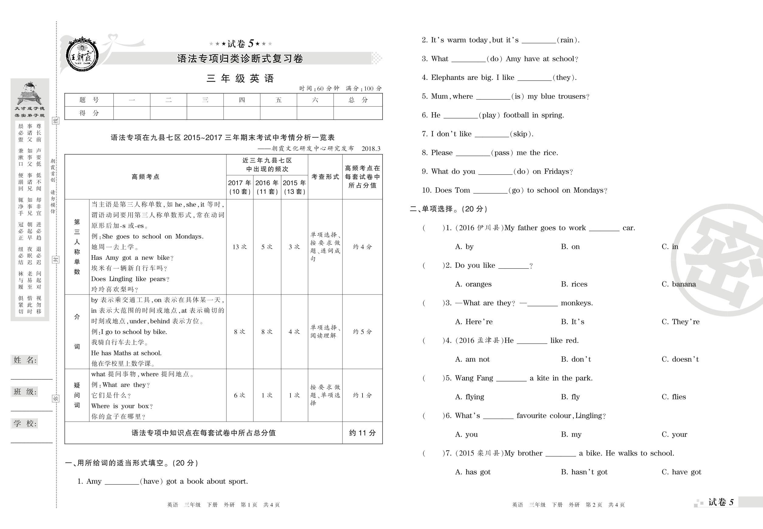 王朝霞期末专项卷——语法专项归类诊断式复习卷三年级下册英语(外研版)【5】