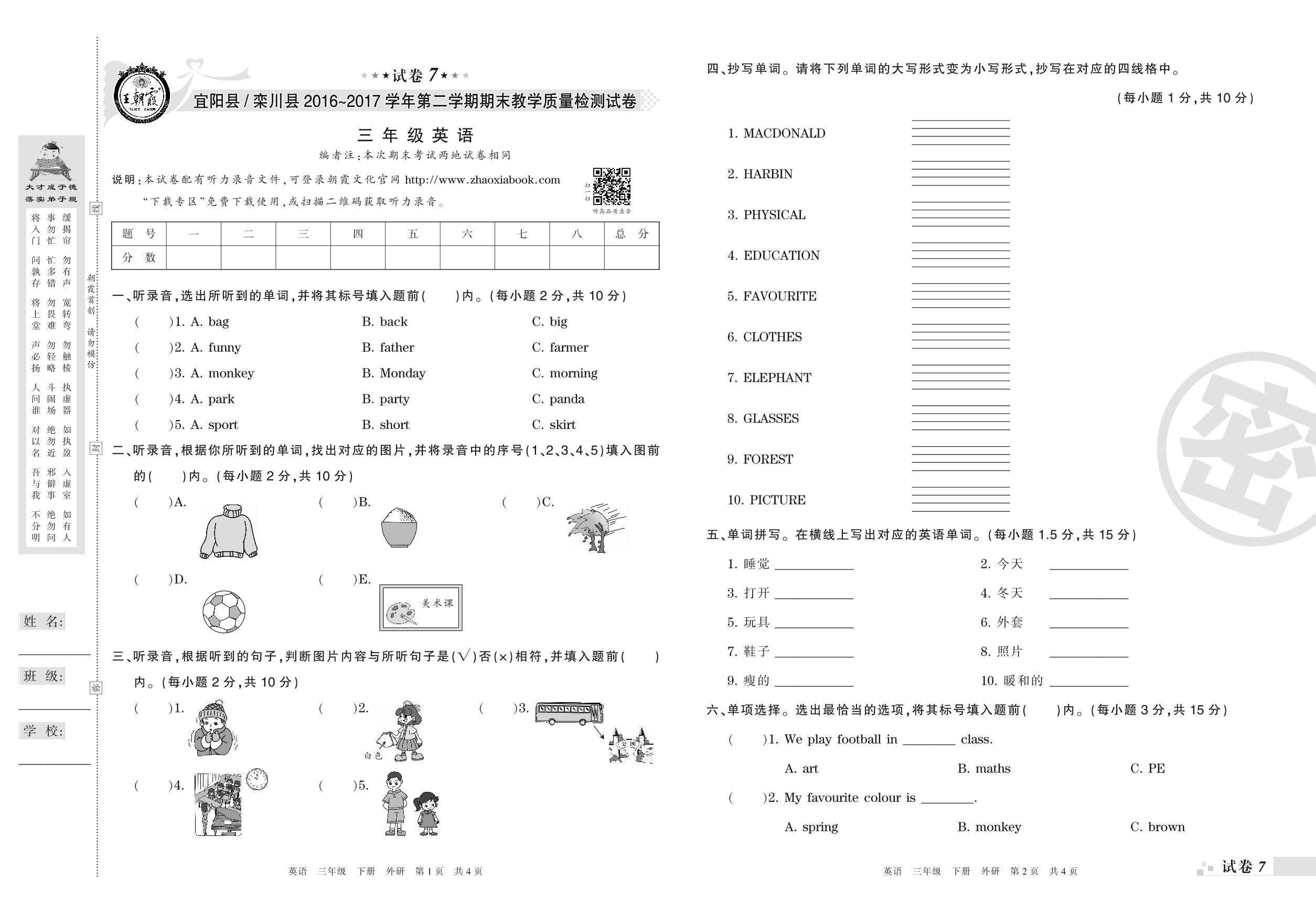 2016-2017学年第二学期洛阳市宜阳县、栾川县三年级英语试卷(外研版)【7】