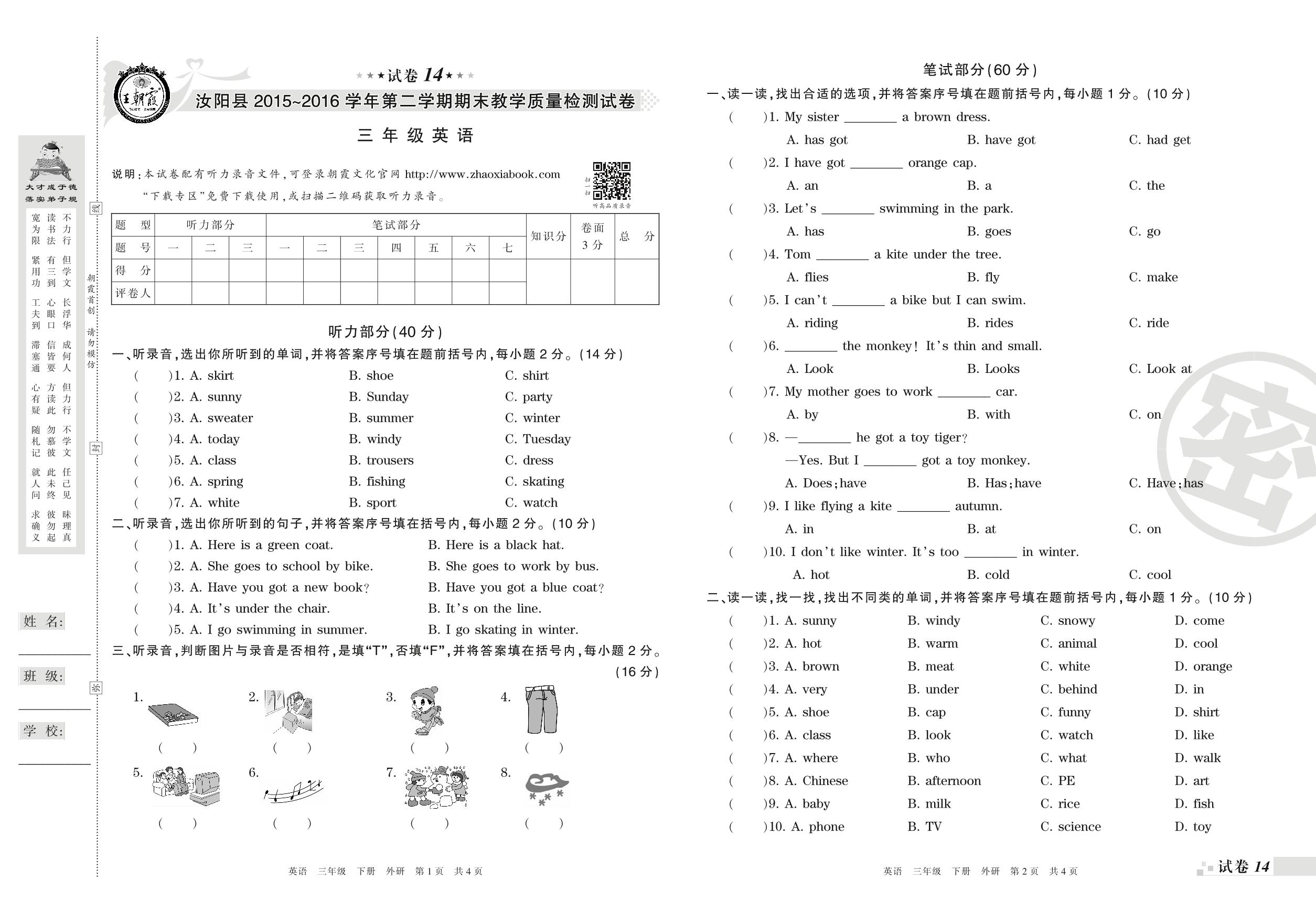 2015-2016学年第二学期洛阳市汝阳县三年级英语试卷(外研版)【14】
