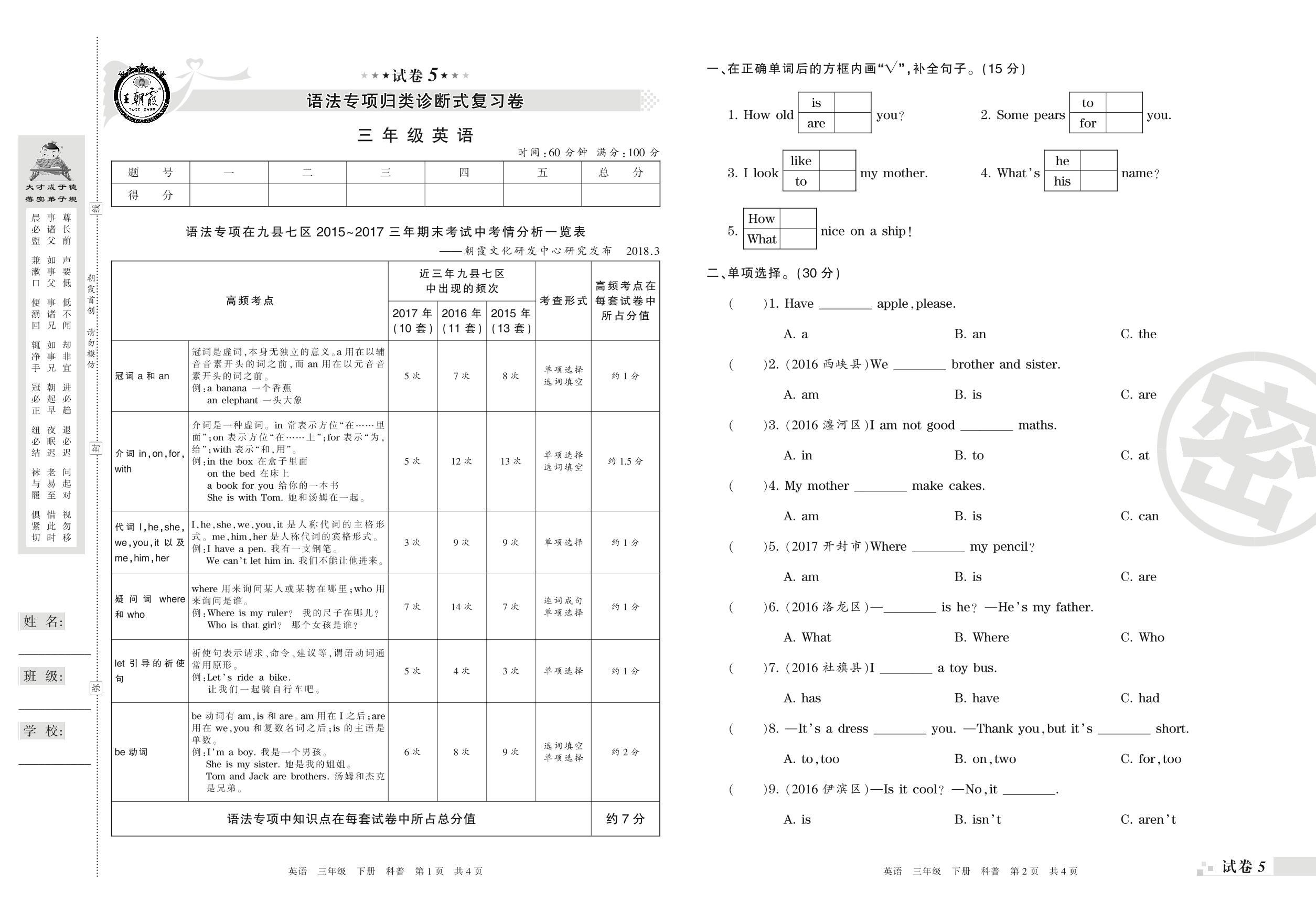 王朝霞期末专项卷——语法专项归类诊断式复习卷三年级下册英语(科普版)【5】