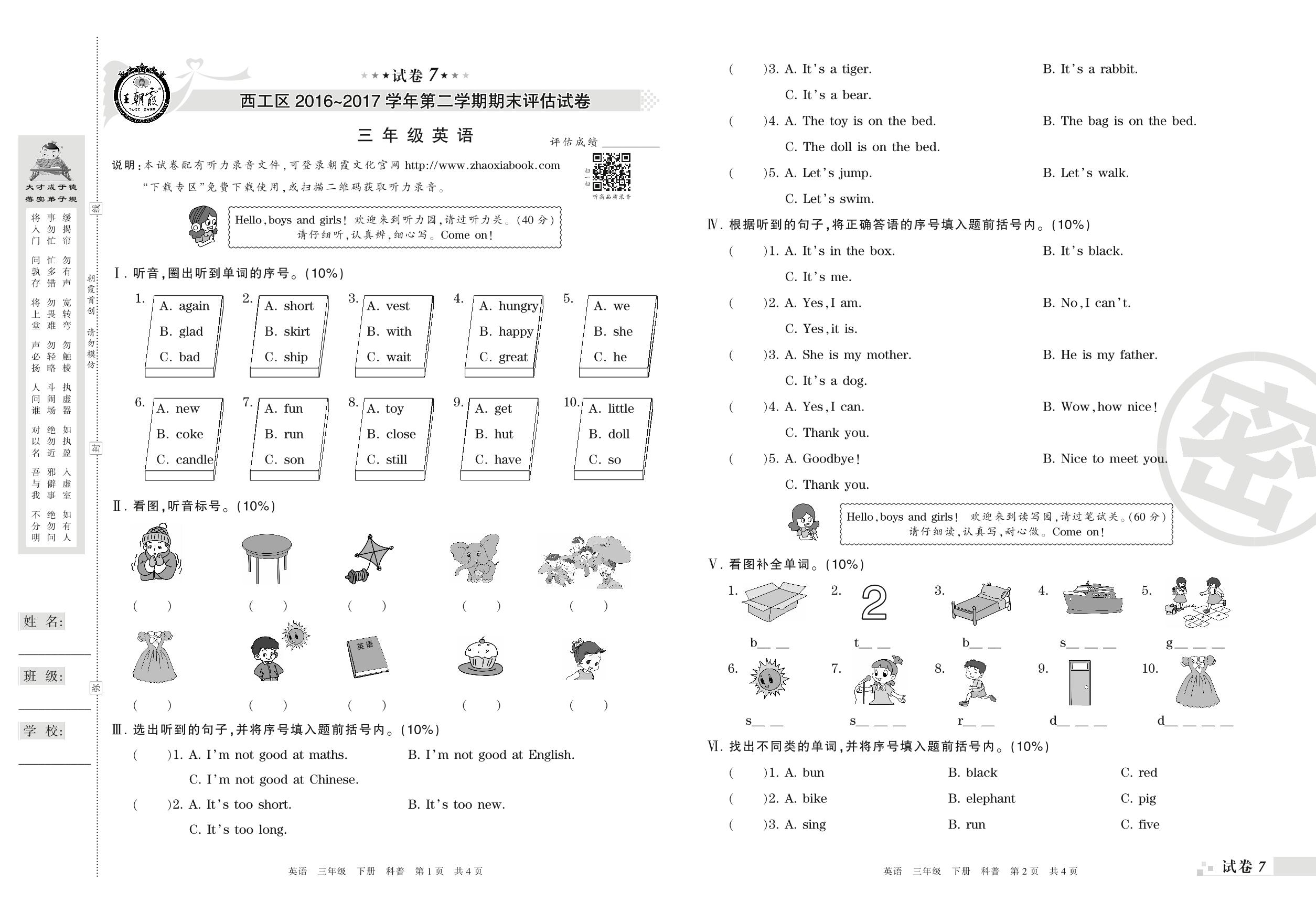 2016-2017学年第二学期洛阳市西工区三年级英语试卷(科普版)【7】