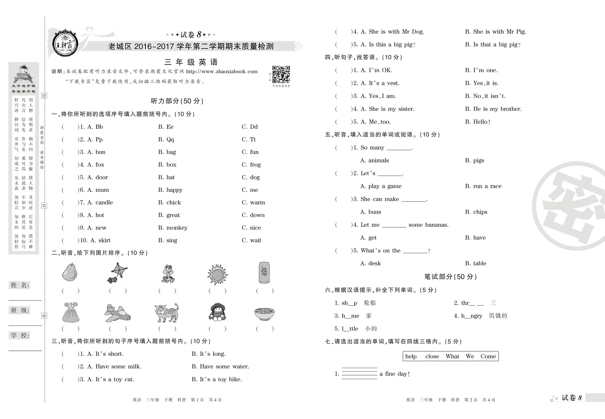 2016-2017学年第二学期洛阳市老城区三年级英语试卷(科普版)【8】