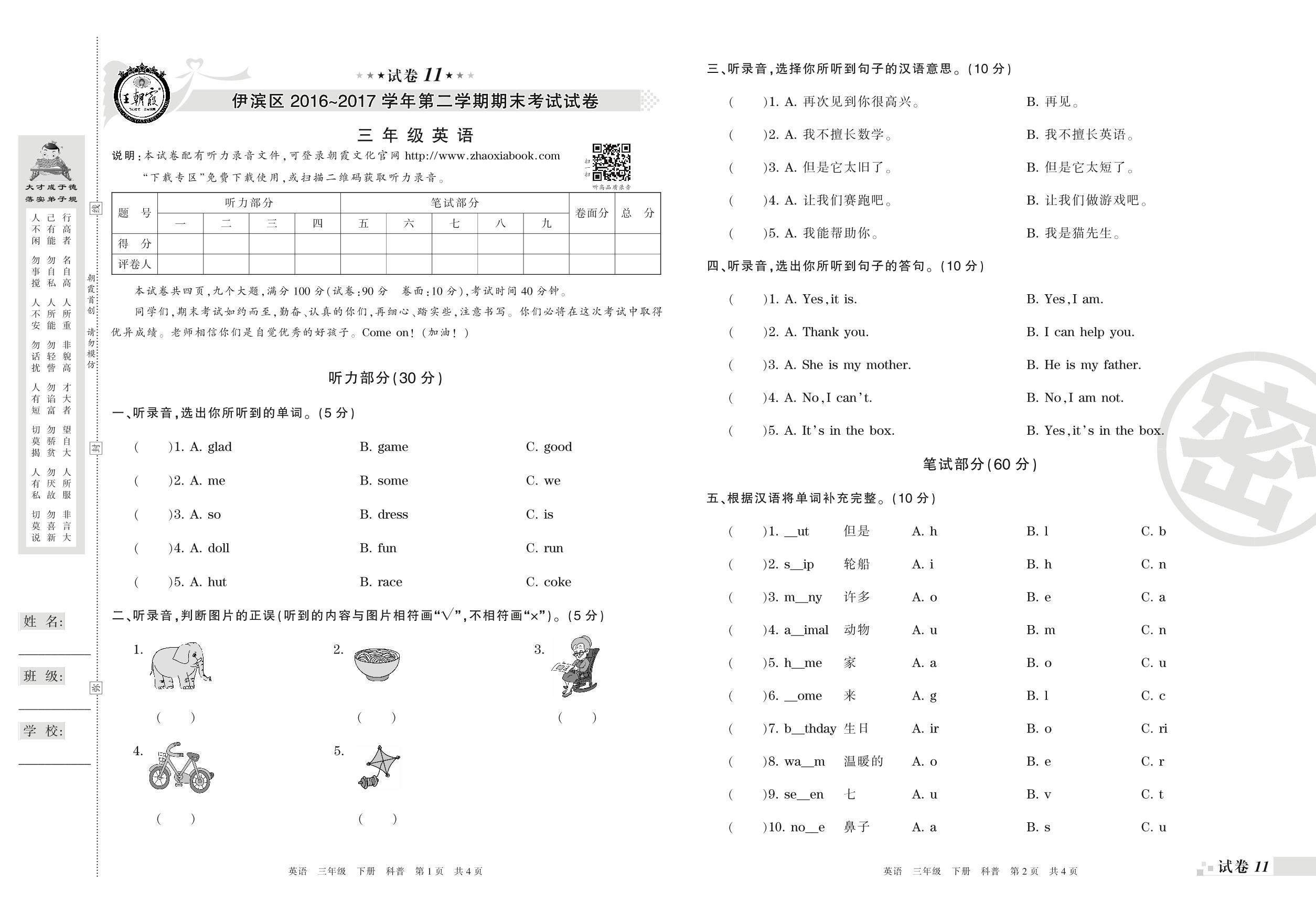 2016-2017学年第二学期洛阳市伊滨区三年级英语试卷(科普版)【11】