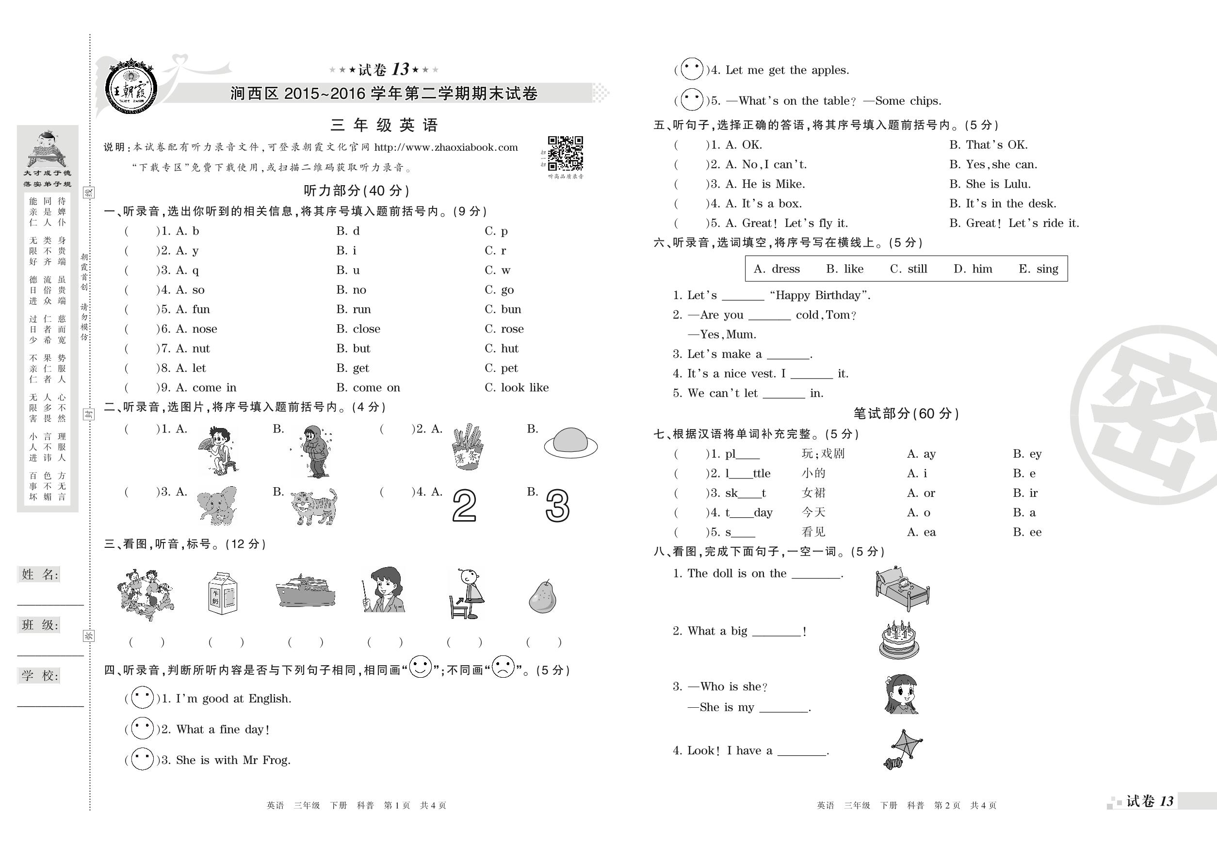 2015-2016学年第二学期洛阳市涧西区三年级英语试卷(科普版)【13】