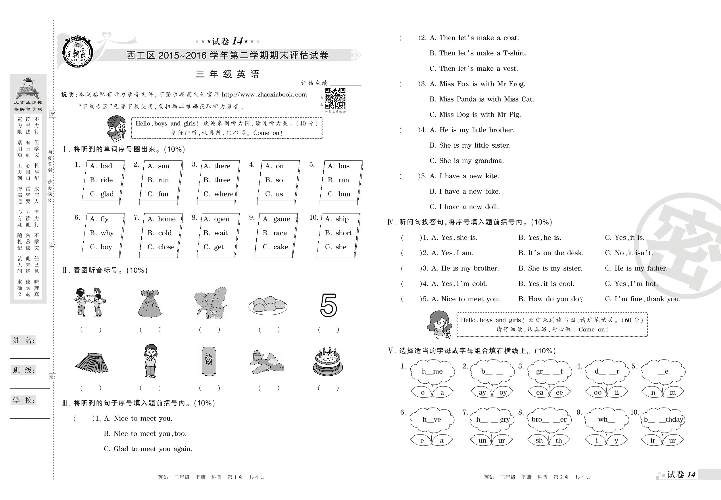 2015-2016学年第二学期洛阳市西工区三年级英语试卷(科普版)【14】