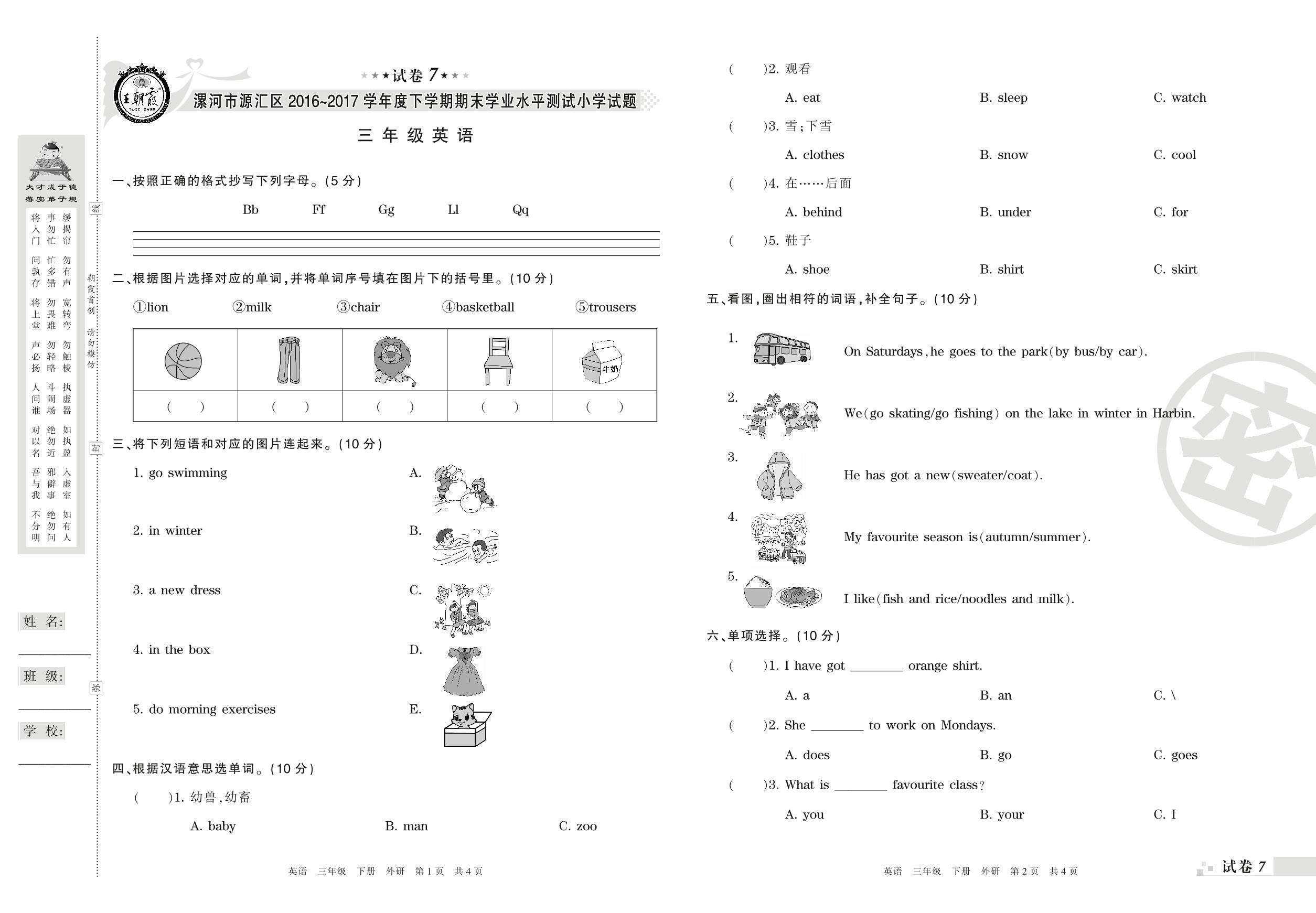 2016-2017学年第二学期漯河市源汇区三年级英语试卷(外研版)【7】
