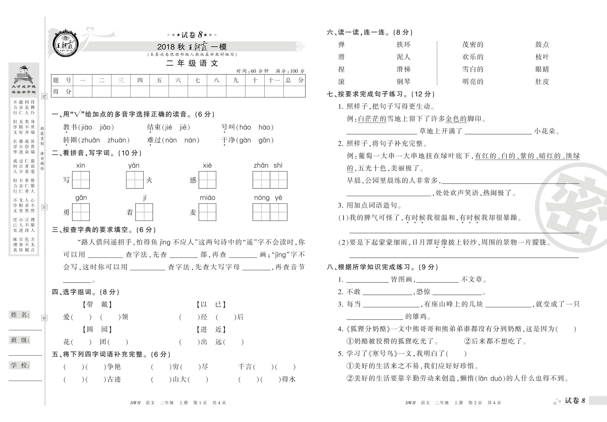 王朝霞期末模拟卷二年级上册语文(人教版)_R21080180929【8】