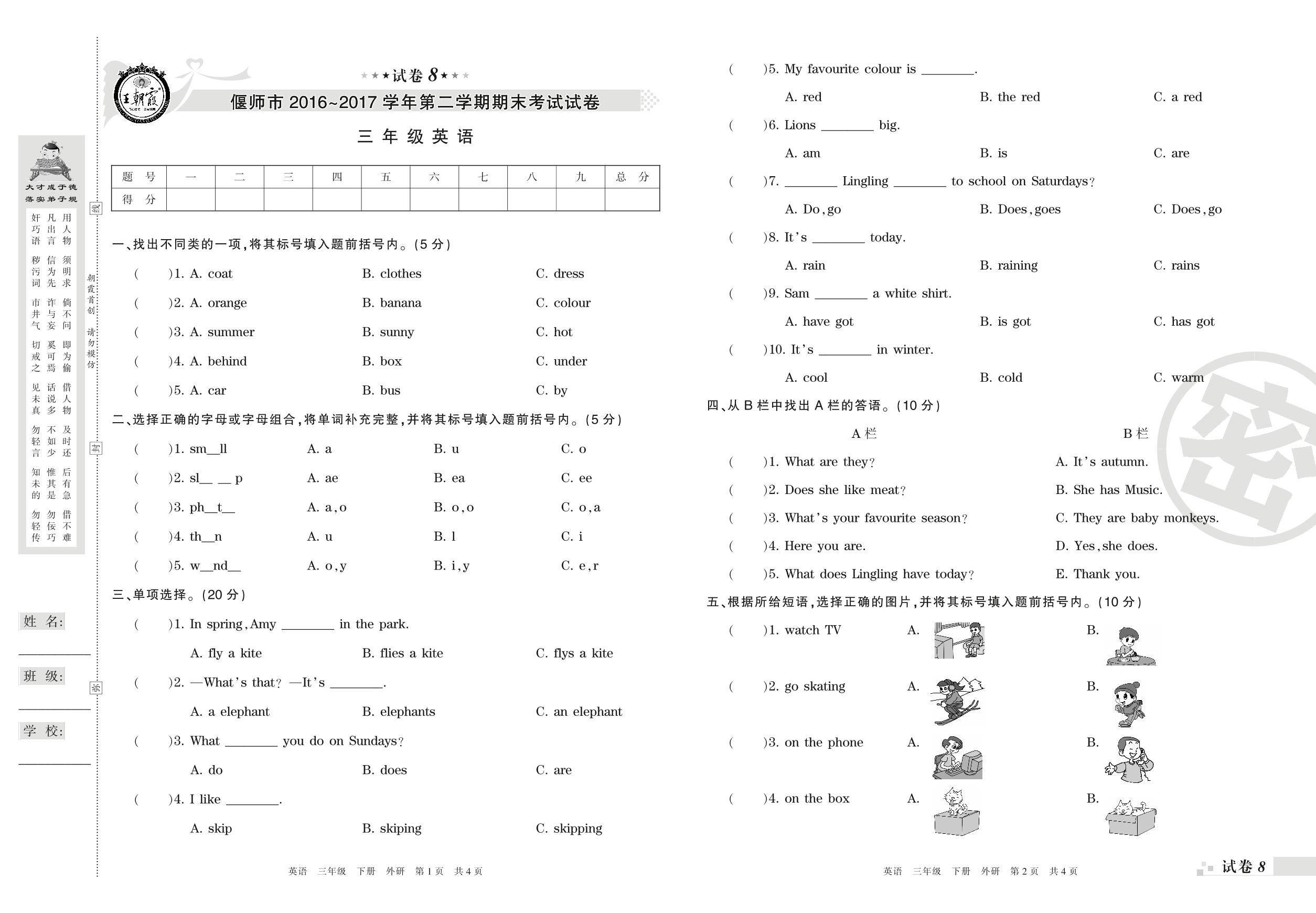 2016-2017学年第二学期偃师市三年级英语试卷(外研版)【8】