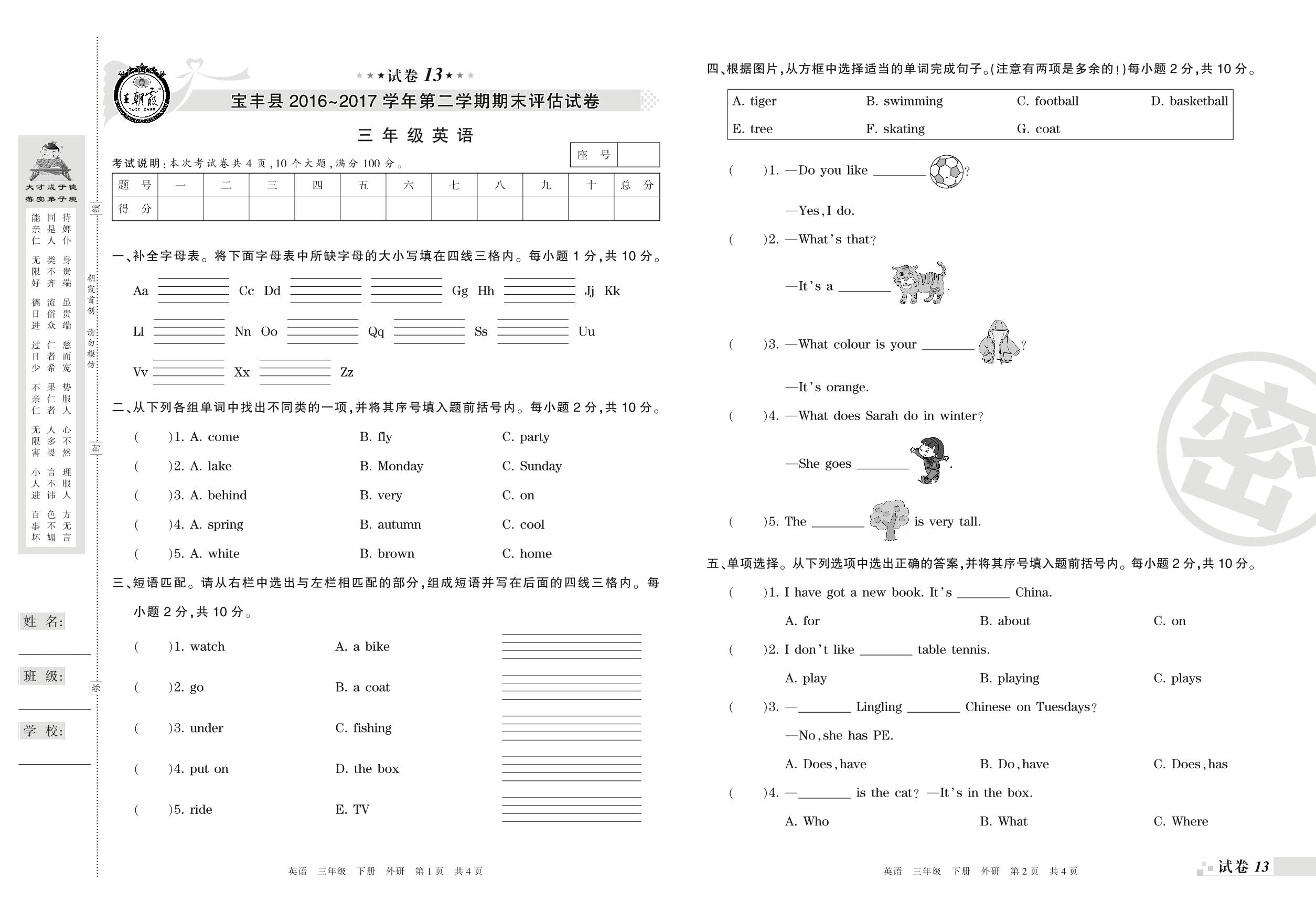 2016-2017学年第二学期平顶山市宝丰县三年级英语试卷(外研版)【13】